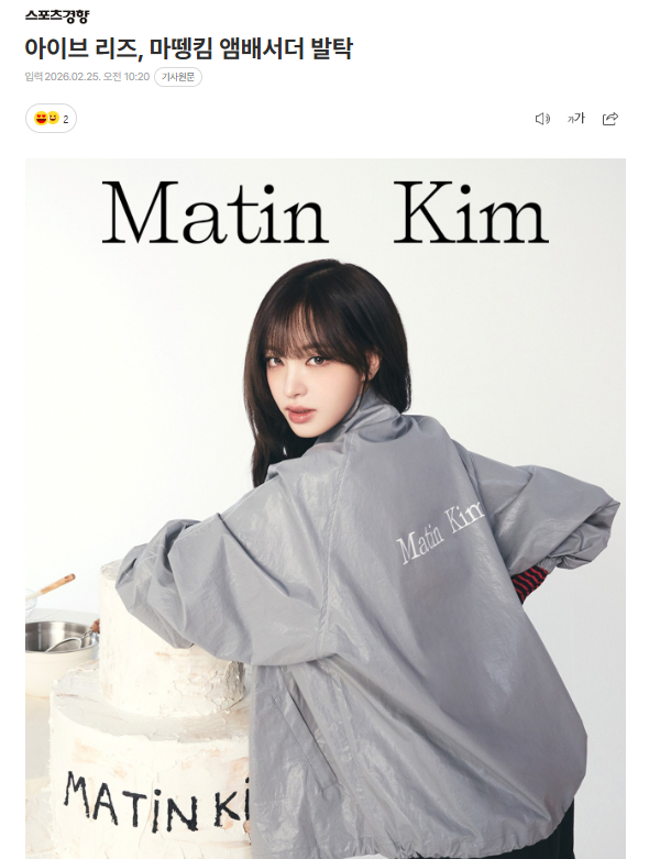 25日Matin Kim公开了与LIZ一起拍摄的画报,并宣布将其选定为2026年SS季度品牌大使的消息。