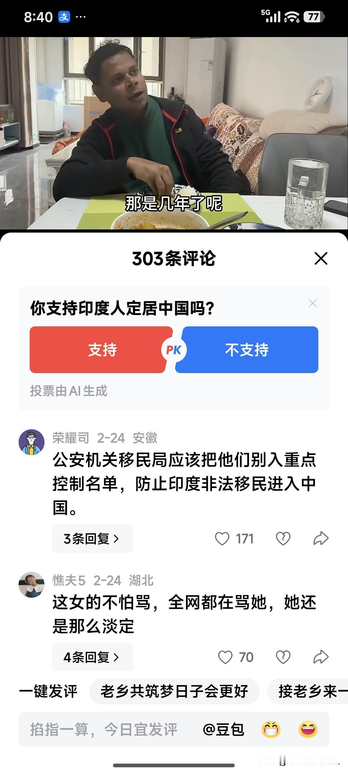 网上看见一个印度小伙儿发的视频,发现一个有趣的话题。那就是“印度小伙儿接老乡来中国筑梦可行吗”! 本以为是一个很平常的视频,可是等我翻到下面的评论区看见评论的时候却让我很吃惊! 其实,说心里话。我不支持印度人定居中国,还有黑人。不是不喜欢,也不是歧视。只是因为我们国家本来人口众多,而他们同样也是来自人口密集的国家,并且他们的生育力又很强,生存和适应能力又比别的地方的人强,时间长了,会成为一大祸害。