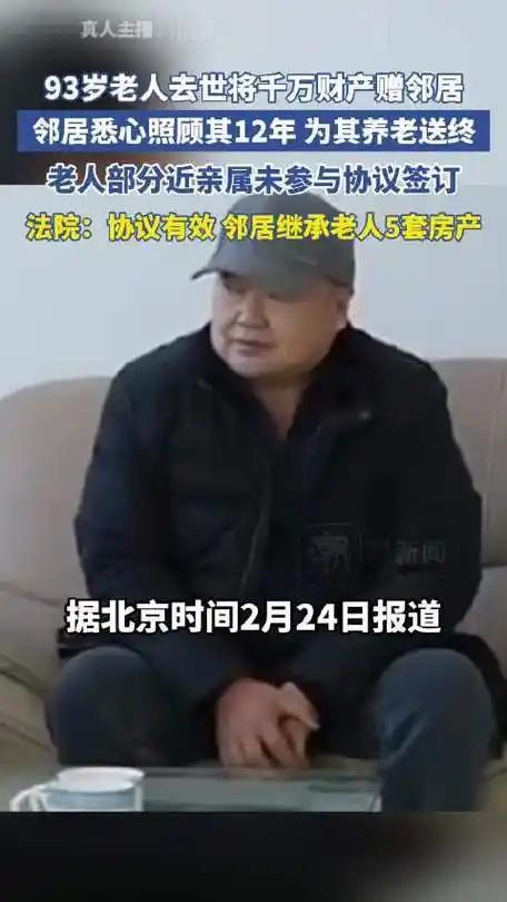 善意终得厚报北京九旬孤老千万家产赠予暖心邻居。 (个人观点仅供参考,无任何不良影响) 老人年过九十三终身无婚无子女独自度过漫长岁月。名下持有五套安置房三百八十余万补偿款整体资产价值超千万元。邻居刘某目睹老人生活艰难主动担负起照顾责任。十二个春秋风雨无阻贴心陪伴温暖老人晚年生活。老人感念这份真挚情谊亲自拟定遗赠扶养协议。身后全部资产尽数交由刘某继承。当地法院开展细致核查工作。确认协议内容真实有效。确认刘某履行全部赡养责任。最终下达合法生效的判决文书。近邻胜过远亲真情跨越血缘。十二年坚守换得真心回馈。法律守护善良正义彰显温度。平凡举动书写人间大爱。真心相待终会迎来最美结局。