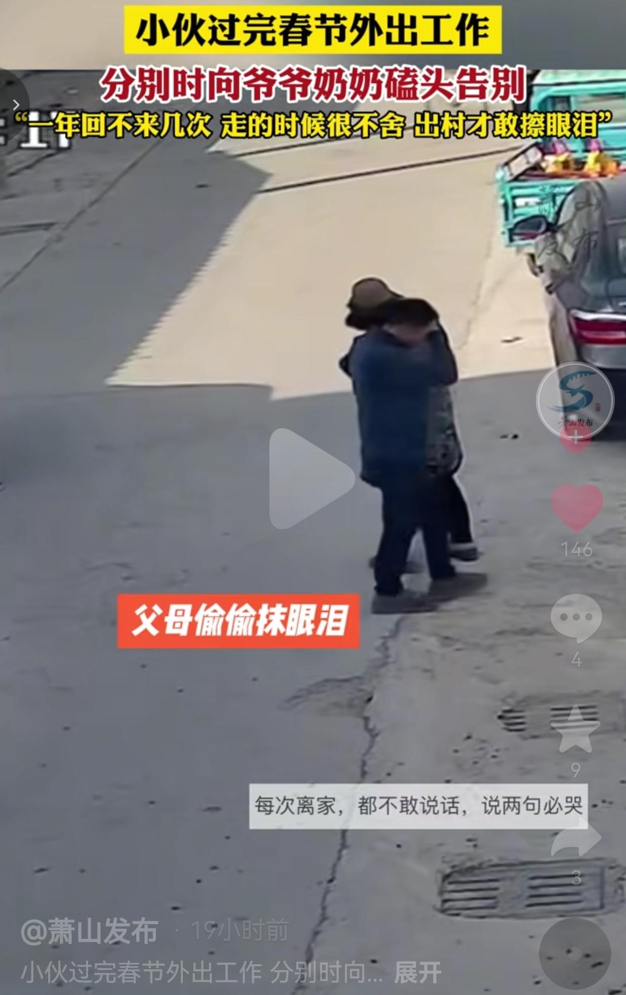 2月21日,正月初五,刚过完年山东菏泽的村口,一位20多岁的小张要骑摩托外出打工了。 在临行前,他摘下头盔,在爷爷奶奶面前膝盖直接软了下来“咚、咚、咚”磕了三个响头,没有说太多煽情的话,只是重重地把额头贴在地上。 爷爷站在旁边,双手叉腰,强忍着没说话,可肩膀却在微微发抖。奶奶背过身去,用袖口抹着眼睛,不敢让孙子看见自己的眼泪。 旁边的父母也在偷偷抹泪,他们说:“每次离家,都不敢说话,说两句必哭。” 小张后来在查看家里的监控时表示:“自己一年回不来几次,走的时候很不舍,怕家人看到我哭,所以出了村才敢偷偷擦眼泪。” 网友们看完视频,评论区直接破防了,有的网友说:“我每次离家,我爸都站在门口抽烟,一句话不说,等我车开远了,我从后视镜里还能看见他。” 也有的网友说:“我爷爷去年走了,现在再想给他磕个头,都没机会了。” 还有的网友说:“这哪是磕头啊,这是把心里的不舍,都砸进了泥土里。” 是啊,这三个响头,不仅仅是简单的告别?更是对爷爷奶奶说:“孙儿不孝,不能在身边尽孝,您二老多保重。”是对父母说:“儿子要去闯了,家里就托付给你们了。”也是对自己说:“再难,也要扛下去,为了这个家。” 这个视频之所以戳中这么多人,是因为我们都在里面看到了自己。 我们总说:“等我们赚够了钱,就多陪陪爸妈。等我们工作稳定了,就带爷爷奶奶去城里看看。等下次回家,我一定好好跟他们说说话。” 可时间从来不会等我们。 所以啊,别再等了。抽空给家里人打个电话,哪怕只是说一句“我想你们了”。回家的时候,多陪爷爷奶奶坐一会儿,听他们唠叨几句。离家的时候,给他们一个拥抱,或者像小张一样,磕个头,说声保重。 大家觉得呢?欢迎评论区唠唠。