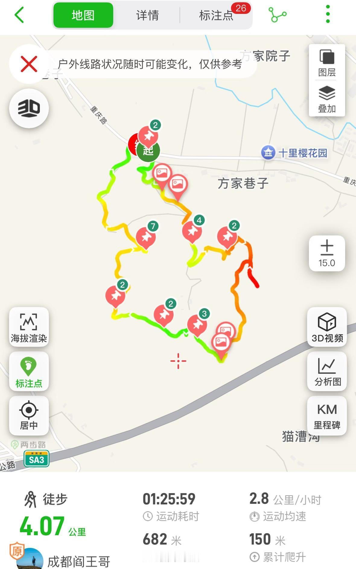 春日徒步,只为花忙,成都1h上春山轻徒步 🌸春暖花开,又到了百花盛开的季节,徒步赏花正当时啊~ ☀️山里春风和煦,虽然骄阳当空,微风阵阵,很是惬意 🌟这是一条非常适合亲子徒步的路线,难度低,花儿多,距离成都近,高新区出发1小时20分钟,开车路况极好,没有山路 📍导航:崇州宝峰村猫漕沟 🅿️停车:停重庆路两边,或者农户家里10元。不需要开上山,上去是窄土路。停车地方徒步上山看花也不远。 ✅山谷的樱花梅花的花期已经接近晚期,但是梨花杏花正在相继盛开 ✅目前人不多,徒步路线平缓。路线比较多,可以走小环线、往返线,或者随意走走转山,沿途都有花儿 ✅我们走的两步路4公里左右的小环线,徒步路线见最后一张图,我们边走边玩,2到3小时走完 ‼️注意: 1,帽子还是需要的,虽然树林可以遮荫,但是大马路没有遮荫哦 2,雨天别去,泥土路较多哦~ 徒步丈量世界 交换春天 春天开幕式 花情实况播报 成都亲子徒步 成都周边游 成都遛娃 樱花盛开的季节 这个季节是属于樱花的 春天就要上春山 踏青赏花正当时 动一动过春天 带着父母去旅行 长辈友好旅行地 成都亲子游 轻松徒步路线 新年旅行第一站新年徒步新年第一天登高望远成都周边赏花好去处露营野餐我是春节主理人 带着父母去旅行 徒步路线推荐