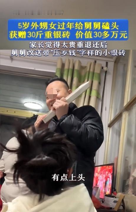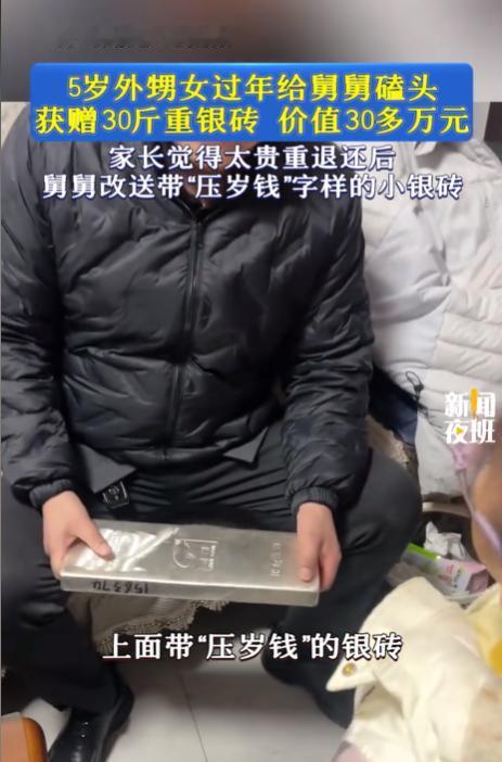 山东临沂,5岁小女孩给舅舅拜年,谁知舅舅竟将一块重达30斤的银砖相赠,可把女孩给乐坏了,然而次日女孩的父母就偷偷把银砖还给了舅舅。舅舅觉得这样不好,于是换了一块价值1000元的小银砖送给了外甥女。 这孩子在家里很受宠,舅舅对她更是上心,平时就把她当成自家孩子一样疼。 那天是过年走亲戚的饭局,亲友都在,桌上热闹,孩子跟着大人拜年。 按当地习俗,小辈要给长辈磕头讨个红包,孩子也照做,嘴里还说着吉祥话。 舅舅喝了点酒,兴致上来,转身从车上搬下一块银砖,分量足足30斤。 银砖往那一放,别说孩子,连大人都愣了一下,现场一下子安静了几秒。 舅舅当着大家的面把话放出去,孩子磕了头,这块银砖就当压岁钱送出去。 小女孩不懂银砖值多少钱,只觉得这东西又大又亮,像个宝贝,立刻跪下磕头,把祝福说得更响了。 舅舅也爽快,当场就把银砖交到孩子这边,算是把承诺兑现了。 孩子两只手抱不住,抬也抬不动,只能围着银砖转,看一眼就笑一眼。 在亲友面前,大人也不好当场推回去,怕让舅舅下不来台,孩子父母就先代为接下。 饭桌散了以后,孩子还惦记着那块大银砖,觉得这是自己收到的最大压岁钱。 回到家,父母越想越不踏实,这份礼太重,已经超过了一般亲戚往来的尺度。 更现实的一点是,孩子年纪太小,对价值没有概念,也不可能自己保管这么贵的东西。 第二天一早,父母把30斤银砖原封不动送回去,话说得很客气,心意领了,东西不能收。 舅舅明白家里人的顾虑,也明白这事传开后,收下银砖的人压力更大。 他不想让外甥女空欢喜,也不想让亲情变成一笔说不清的账。 舅舅就换了个做法,重新拿出一块小银砖,重量几十克,银砖上印着压岁钱几个字。 这块小银砖价值一千多元,礼物有仪式感,分量也在多数人能接受的范围内。 父母这回点头收下,孩子也更容易拿在手里把玩,抱着小银砖照样笑得合不拢嘴。 这段视频发到网上后,很快就引来围观,有人感叹这舅舅出手阔绰了,也有人笑着说想当外甥女。 也有不同的声音,觉得银砖本来是给孩子的,父母退回去像是在替孩子做决定。 从法律上看,5岁孩子属于无民事行为能力人,收不收这份贵重赠与,通常由监护人作决定更稳妥。 当时孩子一脸懵,更多是跟着大人节奏完成拜年动作,很难说她对这份赠与有清晰的接受意识。 父母当场接下,是顾着场面,转天退回也算合乎规矩,避免以后亲戚间生出别的想法。 舅舅改送小银砖这一手,也把尴尬化开了,既不伤面子,也让孩子拿到了压岁钱。 过年给压岁钱,图的是热闹和祝福,钱多钱少都能开心,关键是两家人都舒服。 这家人的做法看着一进一退,实则都在护着同一件事,孩子的快乐,亲情的分寸,往后的来往还要长久。