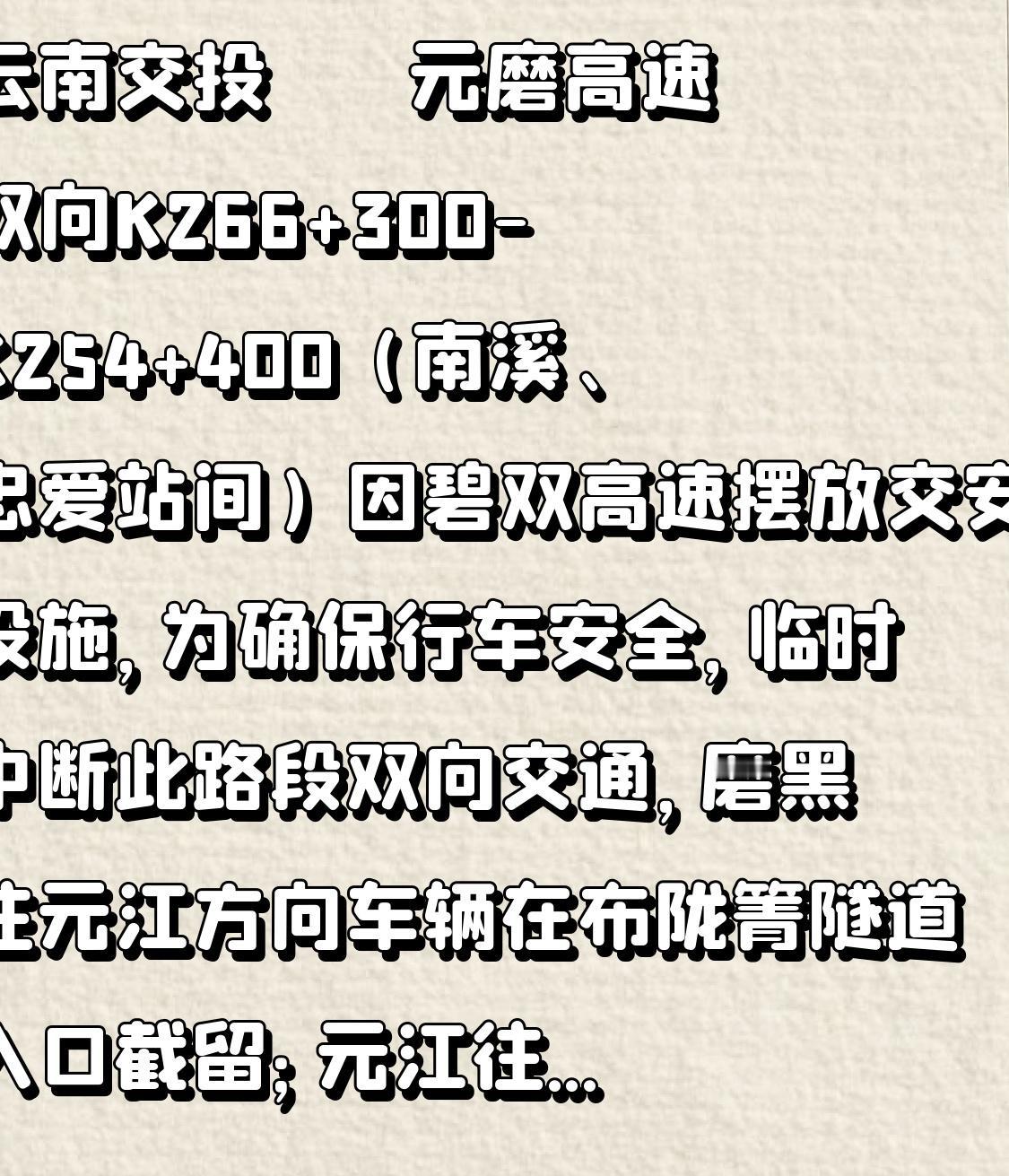 云南交投 元磨高速双向K266+300-K254+400(南溪、忠爱站间)因碧双高速摆放交安设施,为确保行车安全,临时中断此路段双向交通,磨黑往元江方向车辆在布陇箐隧道入口截留;元江往磨黑方向车辆在大风垭口隧道入口截留;墨临高速临沧往墨江方向车辆在K401+000截留。 云南交投 云南高速路况 高速公路