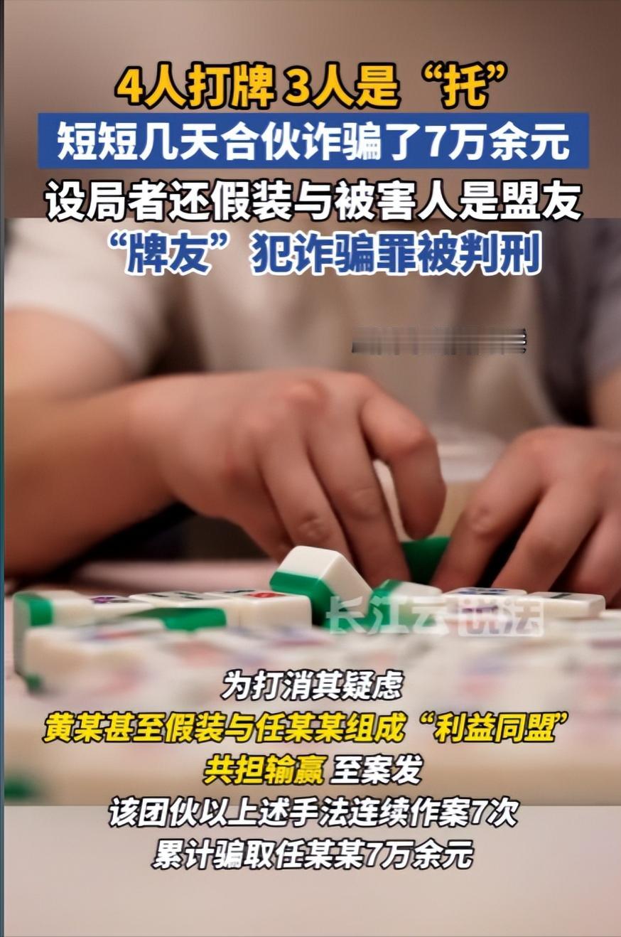 广西钦州,一男子和朋友去打麻将,结果9天输了7万元。男子觉得输得太多,怕向家里无法交代,于是报警希望能追回一部分。可万万没想到,随着警方的深入调查,并非男子技术不行输钱,而是另有内幕。 2024年6月,任某某下班後常去家附近的一家台球俱乐部放松,一来二去,就认识了俱乐部老板黄某。 黄某为人热情,说话也实在,得知任某某喜欢打麻将后,立马拉近关系,说自己也是个麻将爱好者,还主动加了任某某的微信,时不时约他闲聊麻将技巧。 任某某觉得黄某为人豪爽,又有共同爱好,很快就放下了戒心,平日里也会和黄某聊起自己打麻将的趣事,甚至偶尔抱怨自己运气不好,输了点小钱。 任某某不知道的是,他的每一句话,都被黄某记在了心里,成为了后续诈骗的“突破口”。 黄某得知任某某好胜心强,输了钱就想扳本,又对“熟人”格外信任,便立马找到了自己的三个同伙——方某、覃某和简某,几人连夜商量出了一套“杀猪计划”。 几人的分工简单又隐蔽:黄某负责“钓鱼”,以牌友的身份稳住任某某,不断邀约他打麻将; 方某、覃某、简某三人则扮演“互不相识”的牌友,在牌桌上配合作弊,通过手势、牌张摆放传递信息,暗中控制牌局输赢;台球俱乐部则成为了他们固定的作案场地,方便几人串通配合,也能让任某某更加放松警惕。 2024年7月13日,黄某第一次正式邀约任某某来俱乐部打麻将,还特意“凑齐”了四个人,说都是自己的朋友,大家一起玩热闹。任某某没有多想,欣然赴约,甚至还特意带了几千块现金,想着赢点钱补贴家用。 为了让骗局更逼真,几人事先设定了一套复杂的麻将规则,还约定用微信小程序计分,每一分折合20元现金,看似公平公正,实则每一个细节都经过了精心设计。 牌局一开始,黄某等人故意放水,让任某某连连赢钱,不到一个小时,任某某就赢了近千元。 看着手机里不断增加的分数,任某某心里乐开了花,渐渐飘了起来,觉得自己今天运气爆棚,甚至主动提出加大赌注。 这正是黄某等人想要的结果。从第二天开始,牌局就彻底变了味,任某某开始频频输钱,不管怎么换牌、怎么调整打法,都始终赢不了,之前赢的钱很快就全部输了回去,还倒贴了不少现金。 好胜心和侥幸心理冲昏了任某某的头脑,他一心想着扳回一局,只要黄某一邀约,哪怕手里没钱,也会借钱去打麻将。 黄某等人则趁机步步紧逼,一边假装安慰任某某,说“运气总会转过来”,一边继续在牌桌上作弊,让任某某越输越多。 从7月13日到7月22日,短短9天时间,任某某先后参与了7次牌局,累计输掉了7万余元。 这笔钱,是他攒了半年的工资,原本打算用来给孩子交学费、给老人治病,如今一夜之间全部输光。 看着空空如也的银行卡,任某某彻底慌了神,他不敢告诉家人,整夜整夜睡不着觉,思来想去,只能抱着一丝希望报警,希望警方能帮他追回一部分输款,让他能向家人有个交代。 警方接到报警后,并没有简单将其定性为普通赌博,而是注意到了任某某所说的“牌局异常”——为什么一开始连连赢钱,后来却输得一败涂地? 为什么另外四个牌友配合格外默契? 带着这些疑问,警方展开了深入调查,通过调取台球俱乐部的监控录像、查看几人的微信聊天记录、询问相关当事人,一个隐藏在“麻将牌局”背后的诈骗团伙,终于浮出水面。 监控录像清晰地显示,牌局进行时,方某、覃某、简某三人经常通过眼神、手势交流,还会刻意调整牌张的摆放位置,而黄某则时不时给三人使眼色,几人的配合十分隐蔽,不仔细观察根本发现不了。 面对警方的讯问和确凿的证据,黄某等四人再也无法抵赖,如实供述了自己合谋诈骗任某某钱财的犯罪事实。 据四人交代,他们早就商量好,专门找任某某这样好胜心强、信任熟人、又有一定经济能力的人下手,用“先赢后输”的方式,一步步诱导受害者入局。 很多人都觉得,打麻将只是休闲娱乐,只要不赌太大,就不会有问题。 就像这起钦州麻将诈骗案一样,骗子正是利用了受害者对“熟人”的信任,以及“赢钱”的侥幸心理,一步步设下陷阱,让受害者越陷越深。 最终,法院对这起案件作出了判决:黄某等四人以非法占有为目的,虚构事实、隐瞒真相,合伙骗取他人财物,其行为均已构成诈骗罪,且涉案金额7万余元,达到“数额巨大”标准。 案件宣判后,任某某拿到了部分退赔款,他懊悔地说,要是当初没有贪念,没有轻信黄某,就不会落得这样的下场。 麻将本是用来增进感情、放松心情的休闲方式,不该成为骗子谋取私利的工具,更不该成为普通人走向“输钱悲剧”的导火索。