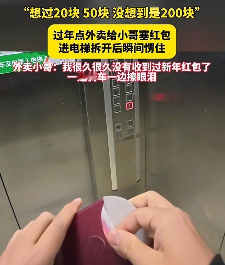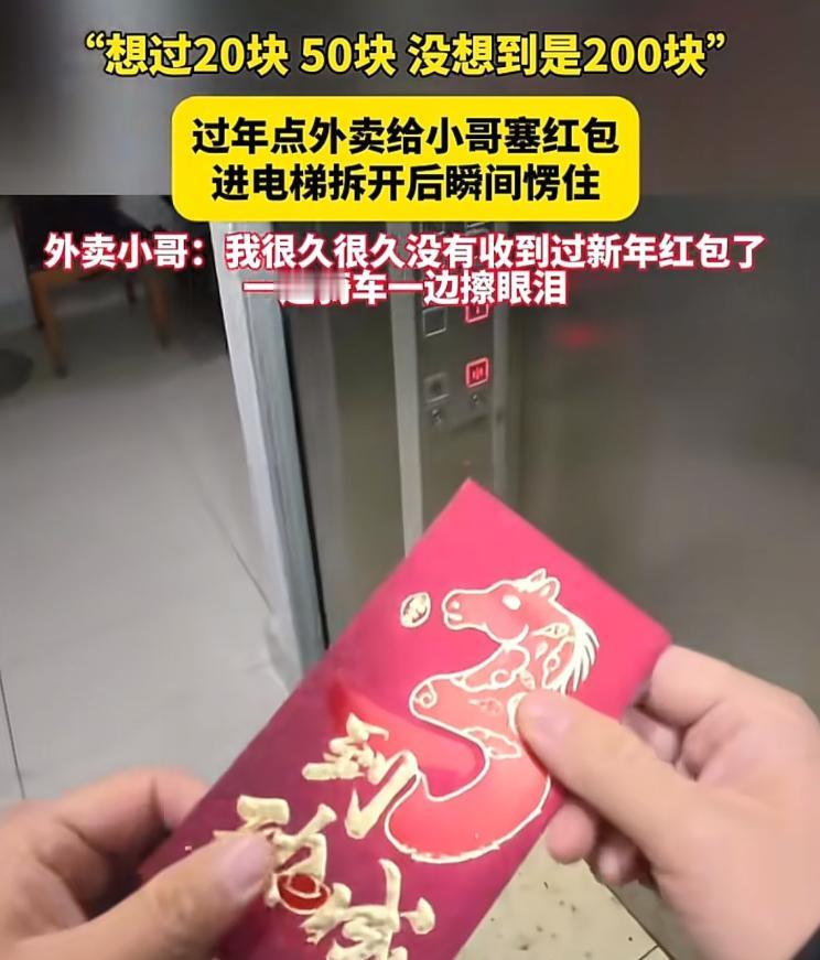 “看哭了!”江苏,外卖小哥大年初一去送外卖,外卖送到后,顾客塞给小哥一个红包,小哥想过里面可能是20、50,可他拆开红包后,当场愣住原地,随后红了眼眶。 春节期间的江苏,城市街巷尚未褪去节日的喧嚣,却已比平日冷清许多。 多数家庭围坐桌前共享团圆,外卖小哥阿生已骑着电动车,在寒风中开启了一天的配送工作。 他没有选择春节休假,核心原因是为家庭多挣一份收入,房贷、孩子的学费与老人的医药费,构成了他必须承担的生活重担。 空荡的街道上,风掠过脸颊带来刺骨的寒意。 阿生的午餐是随身带的面包,冷了就停下车子搓搓双手,再继续赶路。 他原本以为,这个春节会在无尽的奔波与孤独中度过,却没想到一份来自陌生人的善意,会打破这份预设。 当天下午,阿生完成了一单小区配送。 他将外卖送到顾客手中后,对方转身返回屋内,拿出一个红包执意塞给他。 阿生几番推辞,最终在顾客的坚持下收下并表达了感谢。 离开前,他注意到门口堆放的垃圾,主动询问是否需要帮忙带下楼,在得到否定答复后,他走进了电梯。 电梯内,阿生拆开了那个薄薄的红包。 他此前对红包金额的预期停留在 20 元或 50 元,这也是大众春节期间互赠利是的常见数额。 当看到红包内整整 200 元现金时,他瞬间愣住,片刻后眼眶泛红。 200 元对他而言,称得上是一笔 “巨款”,远超他的想象。 离开小区后,阿生骑着电动车继续配送,途中忍不住落泪,抬手不断擦拭眼角。 他坦言,自己已经很久没有收到过新年红包,这份突如其来的馈赠,让他在冬日里感受到了强烈的温暖。 这单外卖的价格,甚至可能不足 200 元,顾客的这份大方,源于对他春节坚守岗位的理解与体谅。 事件被发布到网络后,迅速引发网友讨论。 有网友称赞这位江苏顾客的善良,也有广东网友提出疑问,担心自己过年给外卖小哥的 5 元利是会被嫌弃。 更多网友则表示,红包的核心是心意,数额大小无关紧要,这份祝福本身就值得珍视。 还有网友调侃,若顾客事后反悔,是否能要回这 200 元红包。 从法律层面来看,顾客将红包赠与外卖小哥的行为,属于无偿赠与。 根据《民法典》第六百五十八条规定,赠与财产的权利转移后,非因法定情形,赠与人不得随意撤销赠与。 阿生收下红包的瞬间,赠与合同即成立并生效,他可以安心保留这份心意。 事实上,江苏这位外卖小哥收到 200 元红包的经历,是春节期间最动人的平凡故事。 它既展现了底层劳动者的不易,也彰显了陌生人之间的善意。 这份善意无关阶层,无关数额,是对坚守者的认可,也是对平凡生活的温柔慰藉。 春节期间,像阿生这样的坚守者还有很多。 他们在寒风中奔波,在团圆时刻坚守岗位,用汗水支撑起家庭的希望。 这个 200 元的红包,不仅温暖了阿生一个人,也让更多人看到,平凡人的善意,足以抵御冬日的寒冷,足以给努力生活的人带来前行的力量。 今天的分享到这里就结束了,大家对此事有何看法,欢迎在评论区留言和讨论,感兴趣的可以点击头像加关注,我将每日更新优质内容,我们下期见。