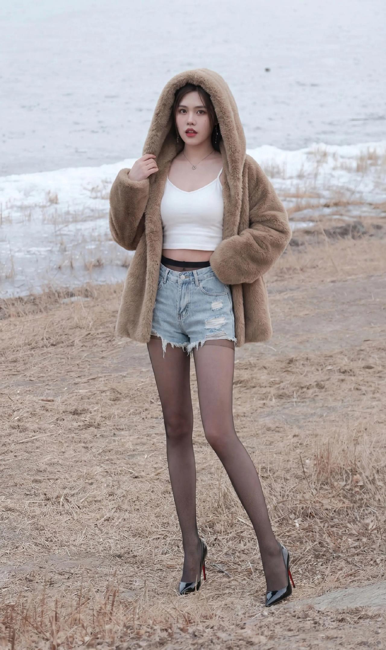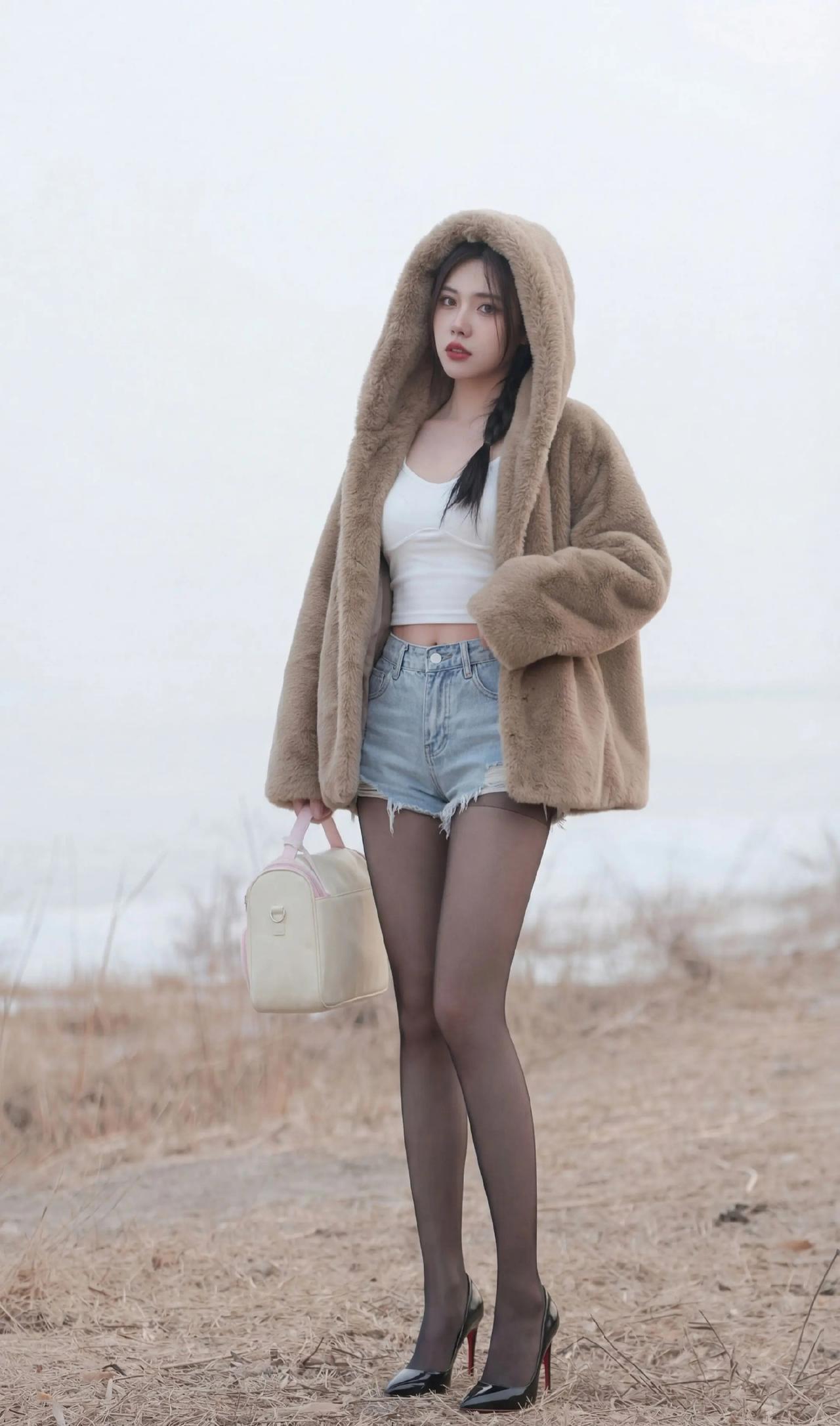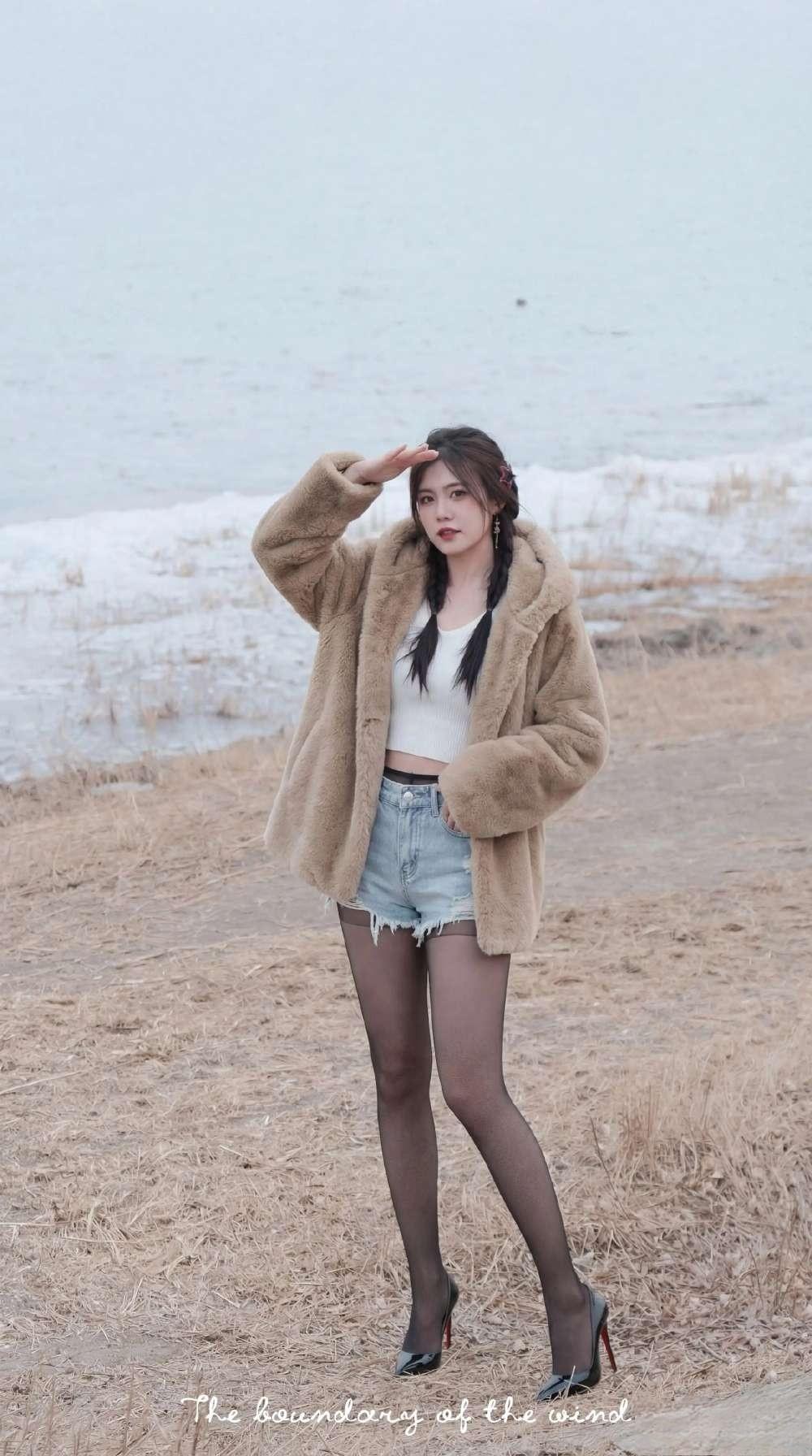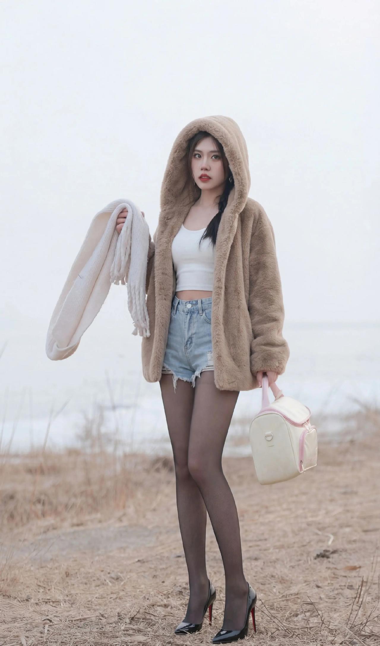 毛绒大衣+短打内搭的碰撞:暖棕毛绒大衣自带慵懒温暖感,内搭露腰白色吊带背心+牛仔短裤,红底高跟鞋又把精致感拉满,又甜又辣的风格特别吸睛咖色毛绒外套 牛仔短裤