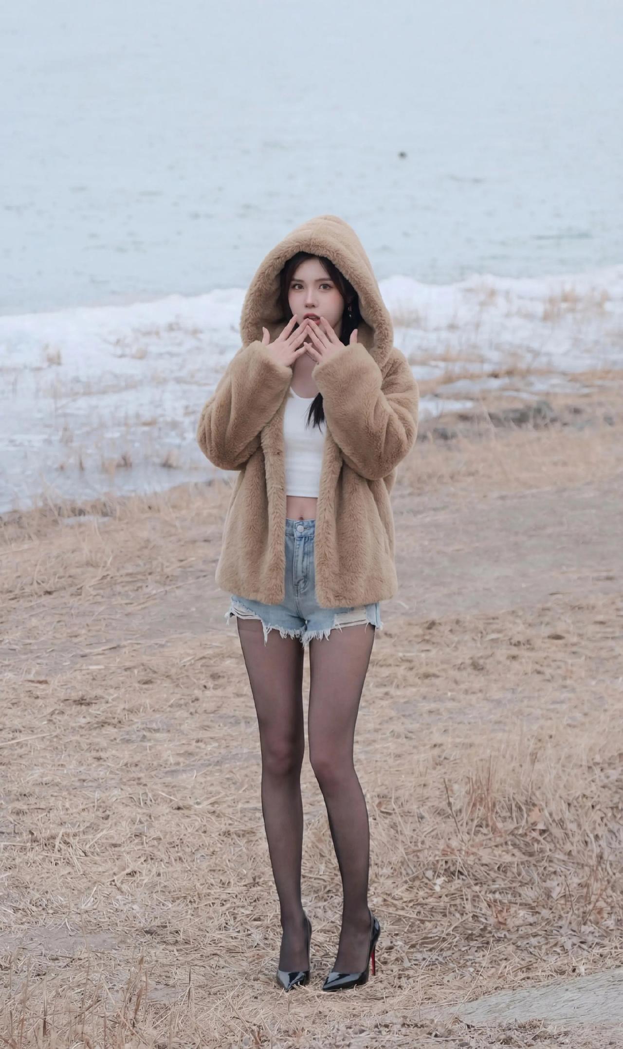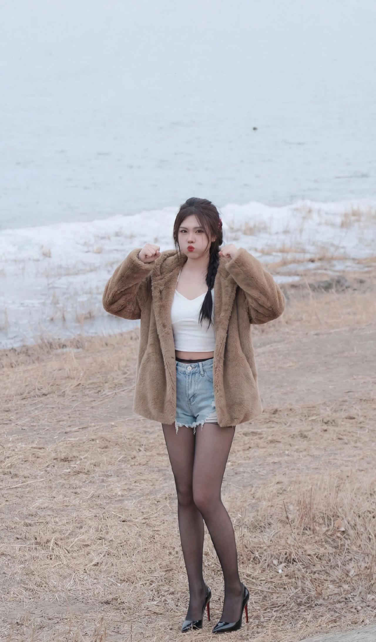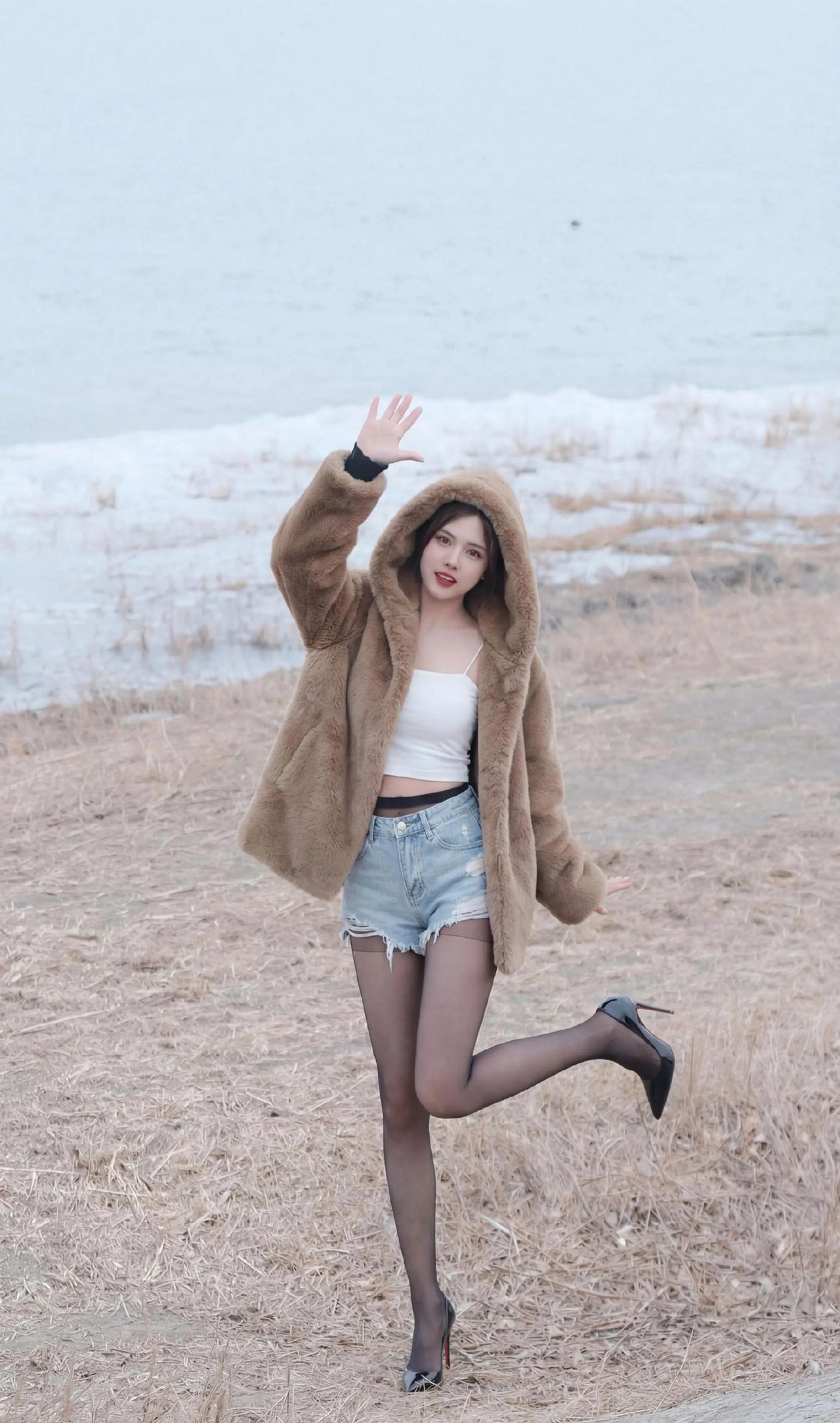 毛绒大衣+短打内搭的碰撞:暖棕毛绒大衣自带慵懒温暖感,内搭露腰白色吊带背心+牛仔短裤,红底高跟鞋又把精致感拉满,又甜又辣的风格特别吸睛咖色毛绒外套 牛仔短裤