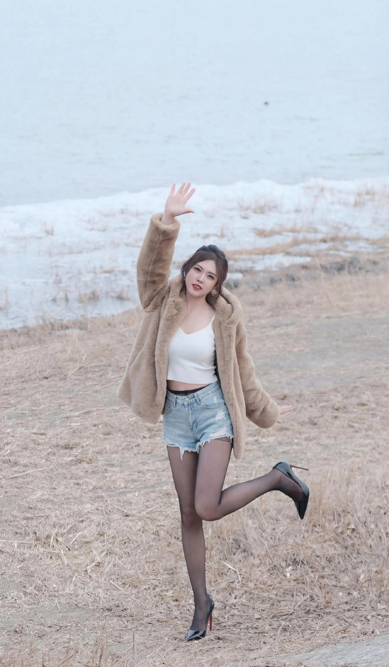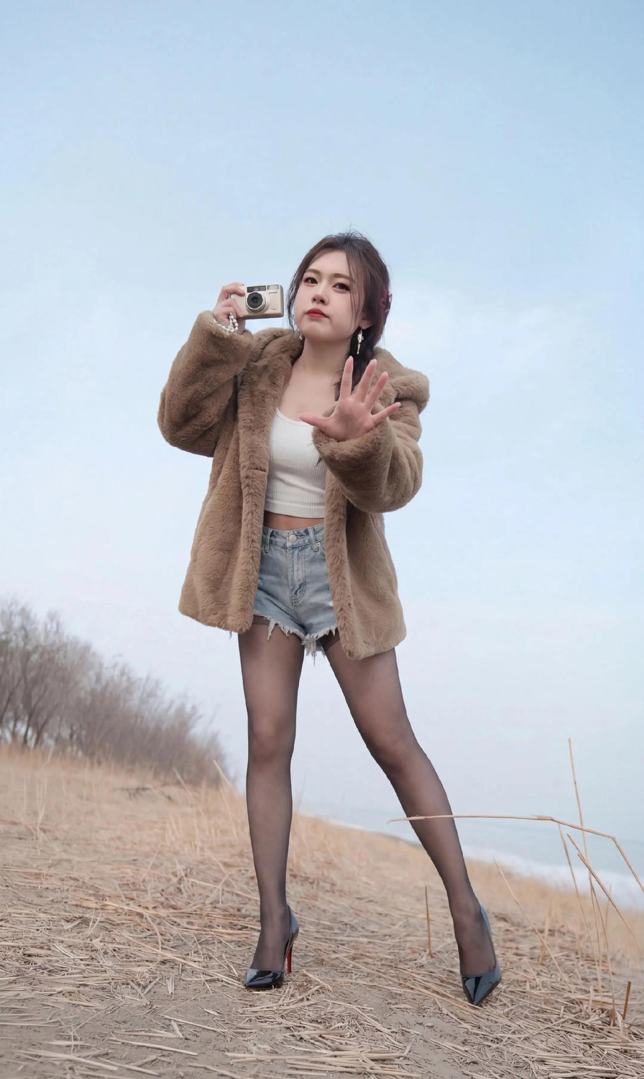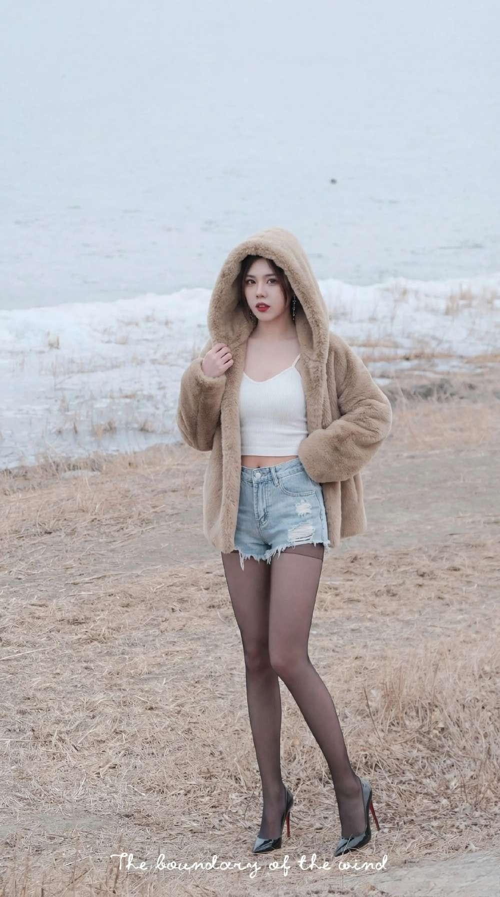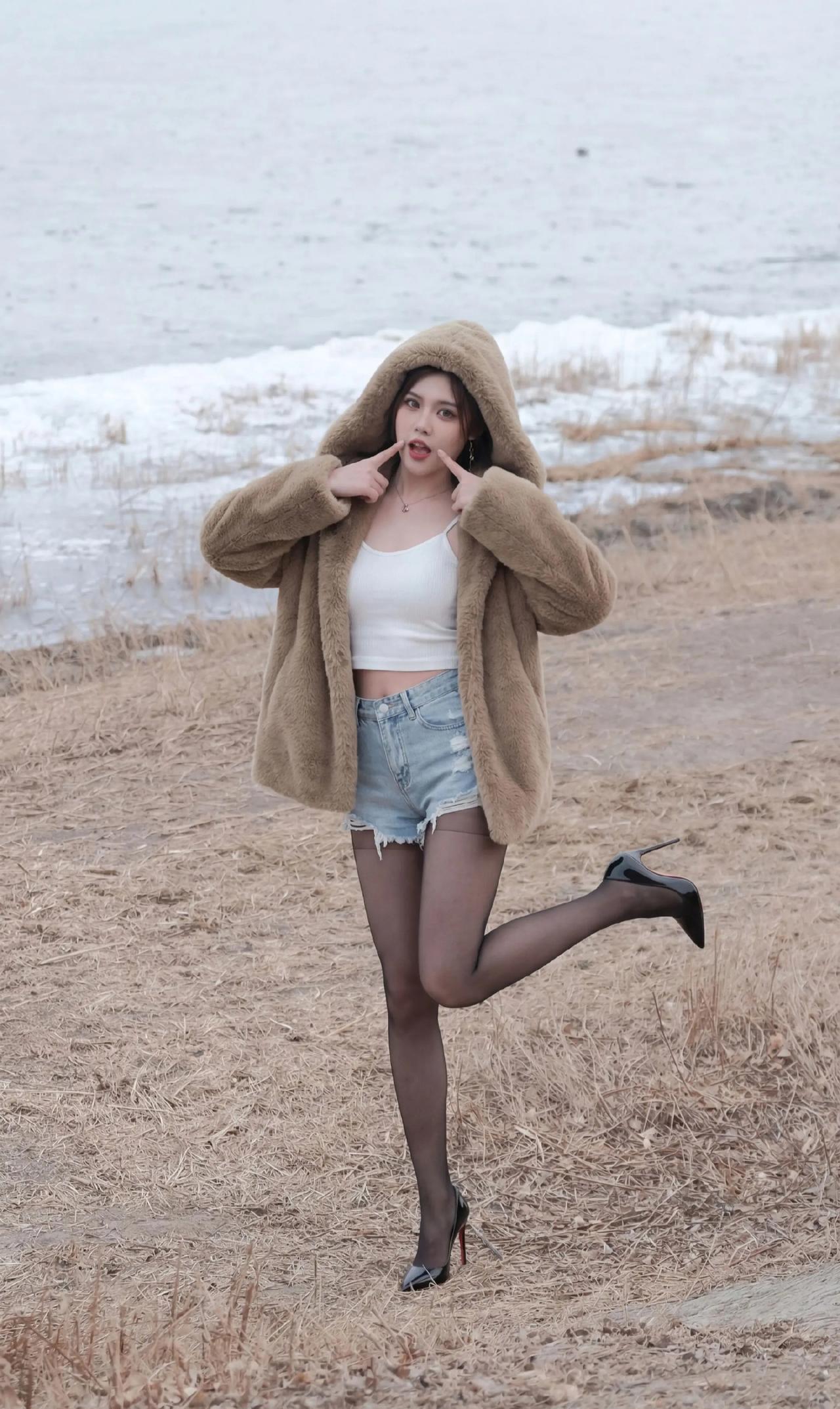 毛绒大衣+短打内搭的碰撞:暖棕毛绒大衣自带慵懒温暖感,内搭露腰白色吊带背心+牛仔短裤,红底高跟鞋又把精致感拉满,又甜又辣的风格特别吸睛咖色毛绒外套 牛仔短裤