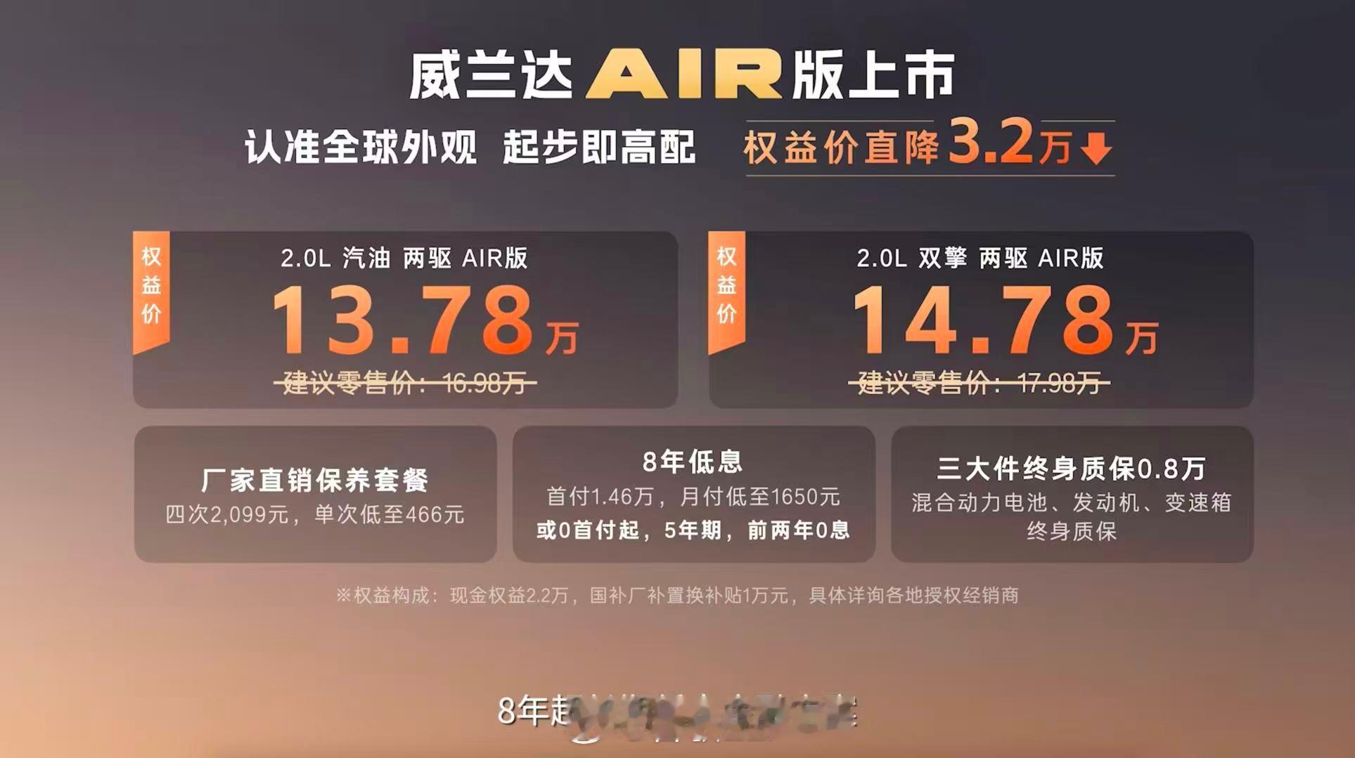除了价格以外,还有一个重点是厂家兜底。,发动机、变速箱、电池三大件终身质保,也就是后续养车修车都不需要用户自己操心了,而且还有广汽丰田发布厂家直销保养套餐,以前大家总觉得4S店修车贵,但现在所有4S店价格标准统一,售后更透明,用的还都是原厂件,放心又省心,这个模式很有新能源车企那味儿!够直给!13万级威兰达AIR版上市