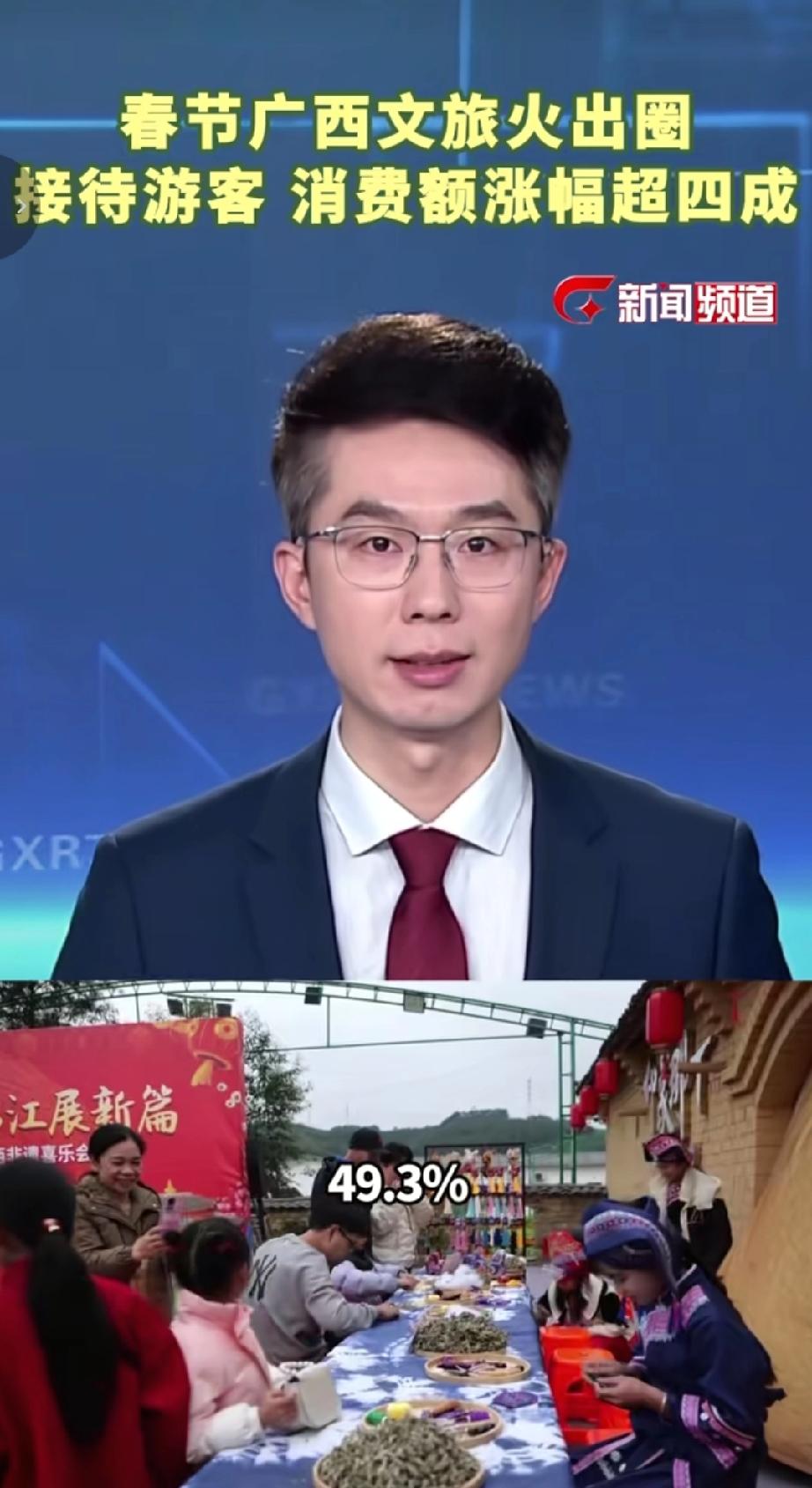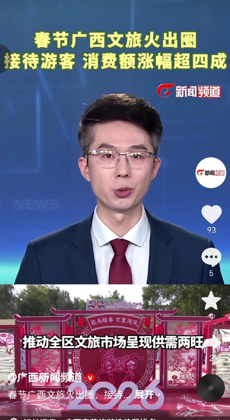 2026年春节广西文旅火爆的核心数据及亮点(2月24日官方发布)2026年春节9天假期,广西文旅市场供需两旺,接待游客总人次、游客消费额同比分别增长41.9%、49.3%,涨幅均超四成,夜间消费规模占比达59.4%,假期夜间消费同比增长37.7% 。桂林:居广西文旅数据首位,接待游客1253.69万人次、旅游收入138.94亿元,同比均增超33%,漓江、遇龙河等核心景区客流火爆 。北海:接待游客621.21万人次(同比增18.45%)、旅游收入66.33亿元(同比增20.31%),入境游客及消费同比分别大涨64.0%、68.0%,区外游客占比达95.6% 。重点商圈/古街:梧州骑楼城、百色解放街客流量、营业额均翻倍增长;南宁之夜、钦州老街客流量同比分别增47%、70% 。(来源于@广西新闻频道 )