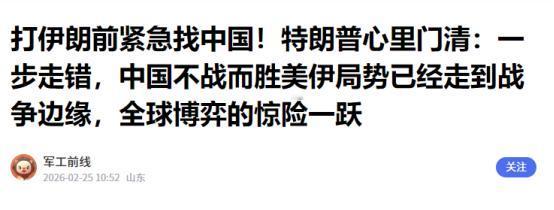 打伊朗前,美国找到中国,特朗普知道:他错一步,中国就不战而胜 当下美伊局势已经紧张到极点,美国在中东集结了近23年来最大规模的空中兵力,几百架战机部署到位,特朗普更是多次放出狠话,称伊朗如果不接受美国的协议,就会面临前所未有的轰炸。 所有人都在猜,美国会不会真的对伊朗动手。 特朗普心里有本明账,他很清楚,如果把架势摆到这种程度,最后却没敢打伊朗,全世界都会把他叫做“怂包总统”。这对极度在意自身形象的他来说,是绝对不能接受的事。所以从现实情况看,特朗普对伊朗动手的概率确实很高。 但奇怪的是,就在战争一触即发的关头,美国却先找上了中国。根据路透社的报道,当地时间2月23日,美国国务院一名高级官员明确表示,希望在2月24日会见中国代表团,专门就军控问题进行磋商。 这个时间点选得太巧,偏偏在美伊开战的节骨眼上,美国放着伊朗的事不管,先来找中国谈,背后肯定有深层原因。这一切的关键,在于美军一把手给特朗普的警告。 美军参谋长联席会议主席丹·凯恩,也就是美军实际上的最高指挥官,直接提醒特朗普,如果美国真的对伊朗采取军事行动,可能会给美国带来重大风险,甚至让美国陷入旷日持久的冲突里,根本脱不了身。 凯恩的警告不是空穴来风,美军高层最担心的,就是美国一旦深陷中东战场,会给中国创造绝佳机会。西方媒体都看得很清楚,一旦美军主力被伊朗牵制,中国在台海方向的行动就少了很多制约。 到时候,美国既顾不上中东,也顾不上亚太,在中美博弈的大局里,中国会不费一兵一卒就占据绝对优势,这就是特朗普最怕的“中国不战而胜”。特朗普虽然在社交媒体上否认美军将领反对开战,还说凯恩认为对伊军事行动会轻松取胜,最终决定权在他手里,但他心里不可能不掂量这个风险。 一边是不打会被当成“怂包”的压力,一边是打了可能深陷泥潭、让中国得利的风险,特朗普只能选择先找中国谈。美国找中国的核心要求,其实很明确。特朗普想通过一份军控协议,把中国拴住,确保中国在近几年内,不会在台海方向采取任何行动。 在他看来,只要能让中国做出这样的承诺,美国就可以放心大胆地对伊朗动手,不用再担心两线作战的问题,也能避免“中国不战而胜”的局面出现。 但美国的这个算盘,打得再精也没用,因为中国根本不可能答应。 中国的立场一直很清晰,中国的核武力量和美俄不在一个层级,没有任何理由参与美俄主导的核削减谈判。从客观现实来说,中国保持自身的战略自主,本身就是对伊朗的一种支持。 只要美国还得顾忌中国这边的态度,就不敢对伊朗肆无忌惮地动手。 除此之外,俄罗斯的行动也让美国不敢轻举妄动。俄罗斯的军舰已经开进伊朗附近海域,准备和伊朗海军开展“米兰-2026”联合军演。 这就意味着,美国如果对伊朗开战,很可能会误击俄罗斯军舰,一旦出现这种情况,就相当于对俄罗斯宣战,这个后果是美国绝对承受不起的。 特朗普现在的处境,可以说是进退两难。打伊朗,要面临深陷持久战、得罪俄罗斯、被中国抓住战略机遇的风险;不打伊朗,就要承受“怂包总统”的骂名,这是他无论如何都不愿接受的。 他选择在动手前找中国谈军控,本质上就是想找个两全之策,既想打伊朗立威,又想堵住中国的战略机遇。 但他心里很清楚,中国不会妥协,他只要走错一步,要么不敢打被全世界笑话,要么打了之后让中国不战而胜。这也是当前美伊局势最核心的矛盾,也是特朗普迟迟不敢最终下令开战的根本原因。