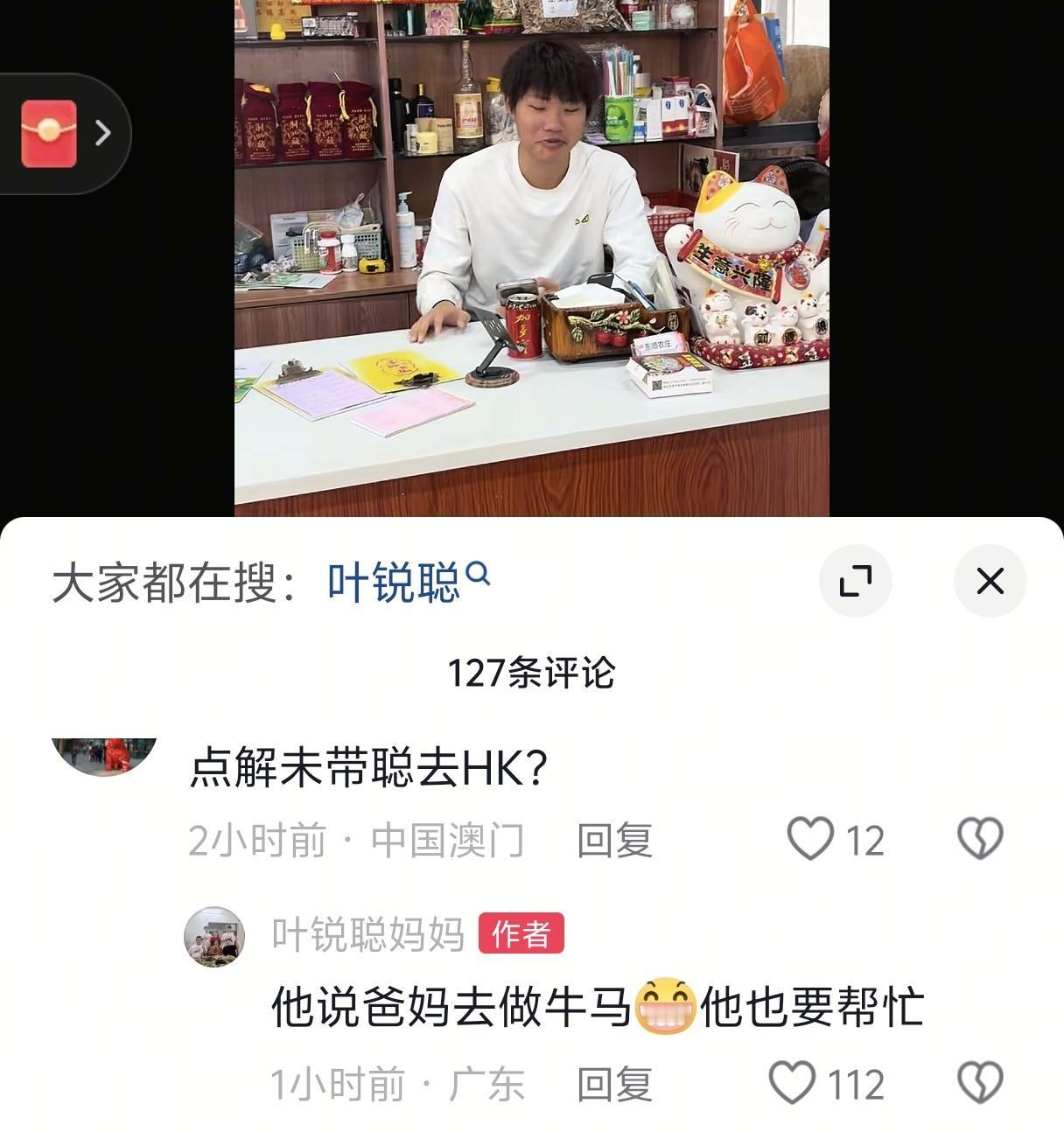 回家就是小老板了!叶锐聪姐姐和弟弟去香港了,叶锐聪跟着爸爸在家守店。 这个假期叶锐聪不用去卖苦力了,在饭店的吧台边玩手机边把钱就赚了。 叶锐聪妈妈说,聪,你过生日的时候我请你吃小龙虾,你不要换我二维码哦! 叶锐聪连连摆手!应该是说不用破费了吧,叶锐聪太节俭了! 这次一家人去澳门,看见贵的东西就舍不得买。 叶锐聪姐姐和弟弟去香港了,他也不去,要去店里帮忙,他说爸爸妈妈要去做牛马,他也要帮忙,真是个懂事的孩子呀。 按说从小过着穷日子,现在有钱了应该报复性消费的呀! 他怎么可能做到如此能控制消费的欲望呢?他怎么做到拒绝去香港的呢?真是个宝藏男孩,面对大富大贵也不改变初心,依然还是那么节俭。 网友开玩笑说,叶锐聪把二维码换了,体验一下钱哗哗到账的感觉[笑哭],如果他真把二维码换了,估计妈妈也会很开心的吧!
