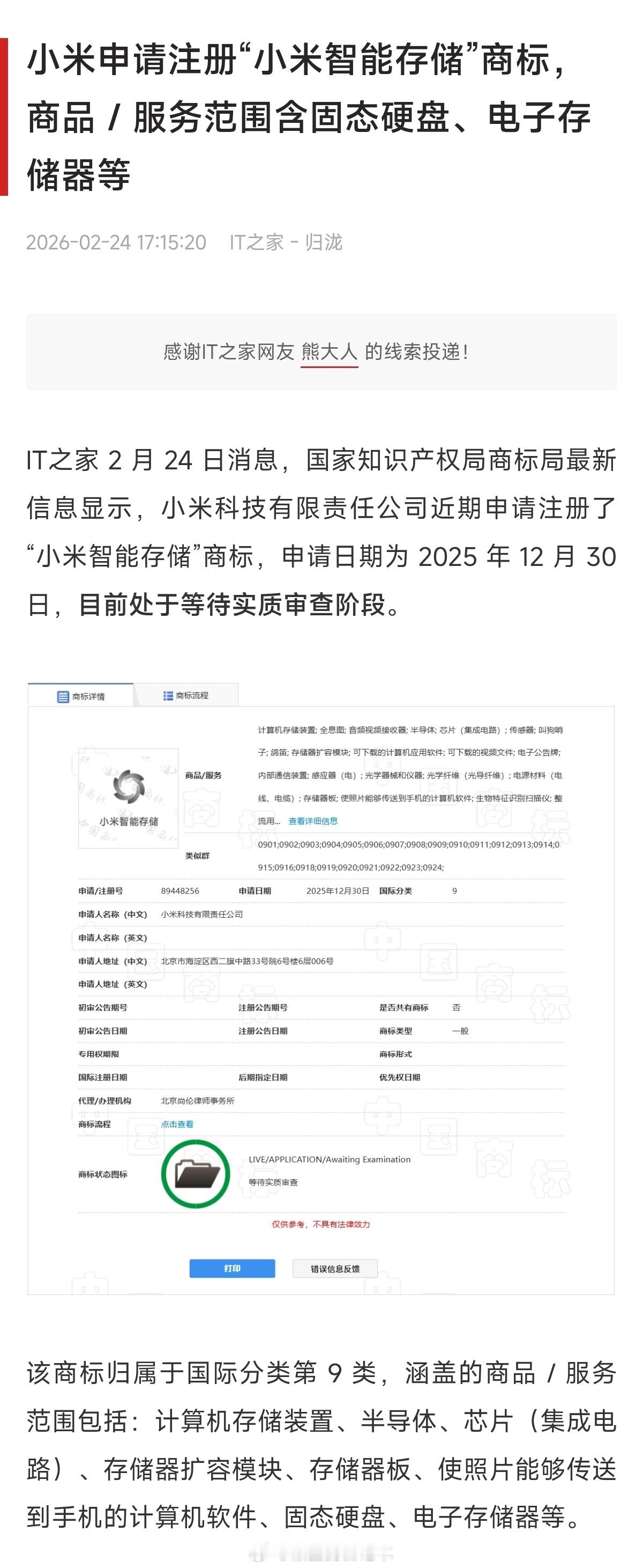 小米为“小米智能存储”申请注册商标。