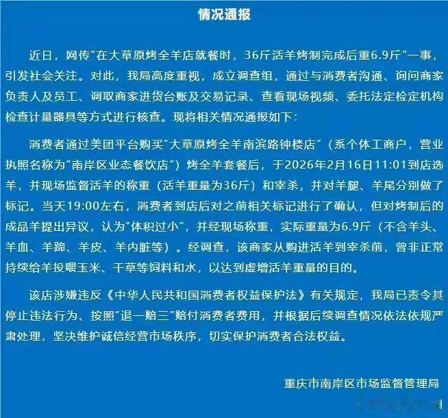 必须为重庆有关部门点赞。重庆一烤全羊店36斤羊烤熟后只有6.9斤,重庆有关部门没有藏着掖着,立刻行动取证,判定商家有欺诈行为,给出理由是活活羊在宰杀前采取非正常手段给羊大量投喂饲料大量喝水,以增加羊的重量,谋取不正常的利润。也就是说,这只羊成了只注水羊。行家都知道,一只正常的36斤羊,烤熟后怎么也在10斤左右。重庆有关部门给出的处罚结果是退一赔三,应该还会有后续更严厉的处罚,像这样商家,处罚一次,让他一辈子都不会再敢去欺诈。