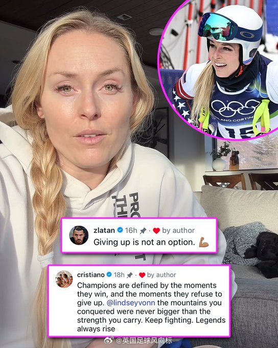 结果,足球两大传奇人物,C罗和伊布,都来到林赛沃恩的贴文下留言,为这名老将送上支持和祝福:
