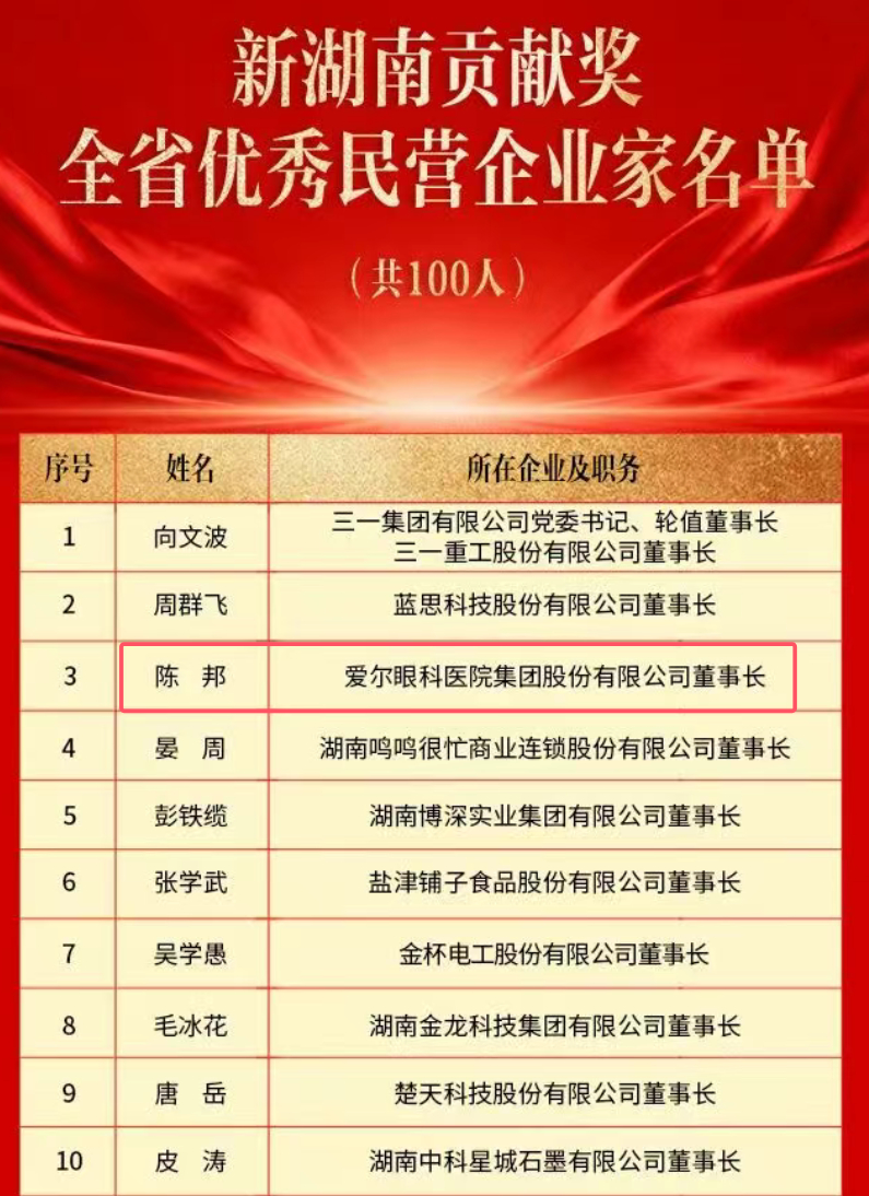 【#爱尔眼科陈邦上榜优秀民营企业家# 】据湖南日报2月24日报道,爱尔眼科医院集团股份有限公司董事长陈邦登上“新湖南贡献奖全省优秀民营企业家名单”。