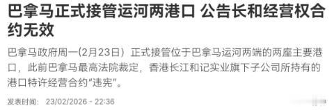 巴拿马对我们的反制与警告不予理会!巴拿马正式接管运河两港口!2月24日,根据法新社报道,法媒称,巴拿马政府周一(2月23日)正式接管位于巴拿马运河两端的两座主要港口。而此前巴拿马最高法院裁定,香港长江和记实业旗下子公司所持有的港口特许经营合约“违宪”。 其实,巴拿马的野心早就有迹可循。根据法新社报道,他们在周一正式动手接管港口,看似是“依法行事”,实则是一场精心策划的“毁约闹剧”,毕竟这份特许经营合约,是双方自愿签订、长期履行的,如今突然以“违宪”为由推翻,纯属无理取闹。 可问题在于,巴拿马似乎忘了,长江和记旗下子公司经营这两座港口多年,投入了大量的资金和人力,把原本冷清的码头,打造成了运河沿线最繁忙的枢纽,如今他们说接管就接管,完全无视商业规则和契约精神。 然而,最让人不齿的是,面对中方的反复警告和反制表态,巴拿马政府始终置若罔闻。他们明知此举会损害中企合法权益,会影响中巴双边关系,却依旧一意孤行,丝毫没有收敛的意思,一副“我就这么做,你奈我何”的嚣张姿态。 更关键的是,中方从来都不是好欺负的。就在巴拿马接管港口的当天,中国外交部发言人毛宁就明确表态,中方将坚决维护企业的正当合法权益,不允许任何国家随意侵犯中企利益。 不过,中方的回应远不止口头警告那么简单。香港特区政府第一时间发声,商务及经济发展局局长丘应桦直接向巴拿马驻港总领事提出严正抗议,态度坚决,没有丝毫退让。 无独有偶,长江和记也早已做好了反击准备。早在本月初,他们就已经依据特许经营合约和国际商会仲裁规则,对巴拿马启动了仲裁程序,索赔金额高达20亿美元,这笔钱,就是对巴拿马毁约行为的有力反击。 话说回来,巴拿马之所以敢这么嚣张,背后难免有外部势力的影子。巴拿马运河作为全球最重要的航运枢纽之一,战略地位极其重要,历来都是大国博弈的焦点,不排除有国家在背后挑唆,让巴拿马充当“马前卒”。 更何况,中方的态度已经非常明确,不会任由巴拿马肆意妄为。无论是外交部的严正表态,还是香港特区的抗议,亦或是20亿美元的仲裁索赔,都在告诉巴拿马:毁约有代价,挑衅需谨慎,中方维护中企权益的决心,不容任何质疑。 除此之外,对比其他国家对待中企的态度,巴拿马的做法更显短视。很多国家都争相吸引中企投资,珍惜与中方的合作机会,而巴拿马却反其道而行之,为了眼前的小利益,不惜破坏双边关系,简直是捡了芝麻丢了西瓜。 说到底,巴拿马无视中方警告、强行接管运河两港口,终究是一场得不偿失的闹剧。他们以为能靠“违宪”的借口强取豪夺,却忘了中方有足够的实力和底气维护自身权益,20亿的索赔只是开始,肆意毁约的后果,终究要由巴拿马自己来承担。 以上是小编个人看法,如果您也认同,麻烦点赞支持!有更好的见解也欢迎在评论区留言,方便大家一同探讨。