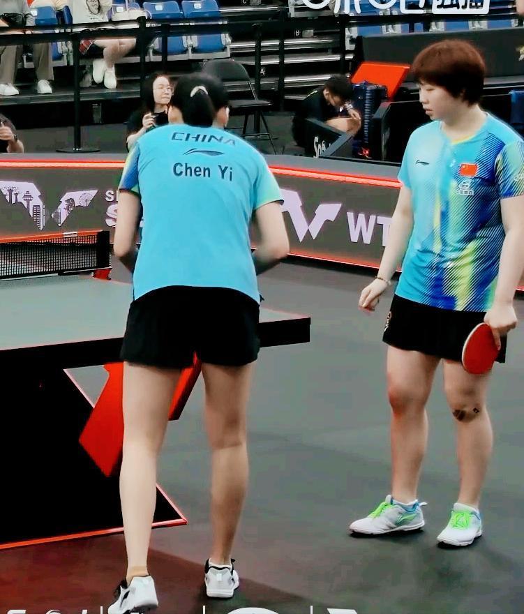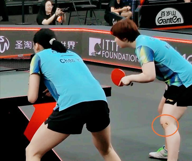坏了,蒯曼受伤了吗?膝盖贴的啥? 今天蒯曼发挥还算正常, 但是膝盖上贴了东西, 应该像肌肉贴, 希望大丫头能健康完赛。 蒯曼和陈熠今天的女双表现完美, 3:1击败了金娜英/柳韩娜, 晋级8强。 其中第四局, 蒯曼和陈熠从3:10落后, 连追8球, 11:10反超, 最终13:11逆转。