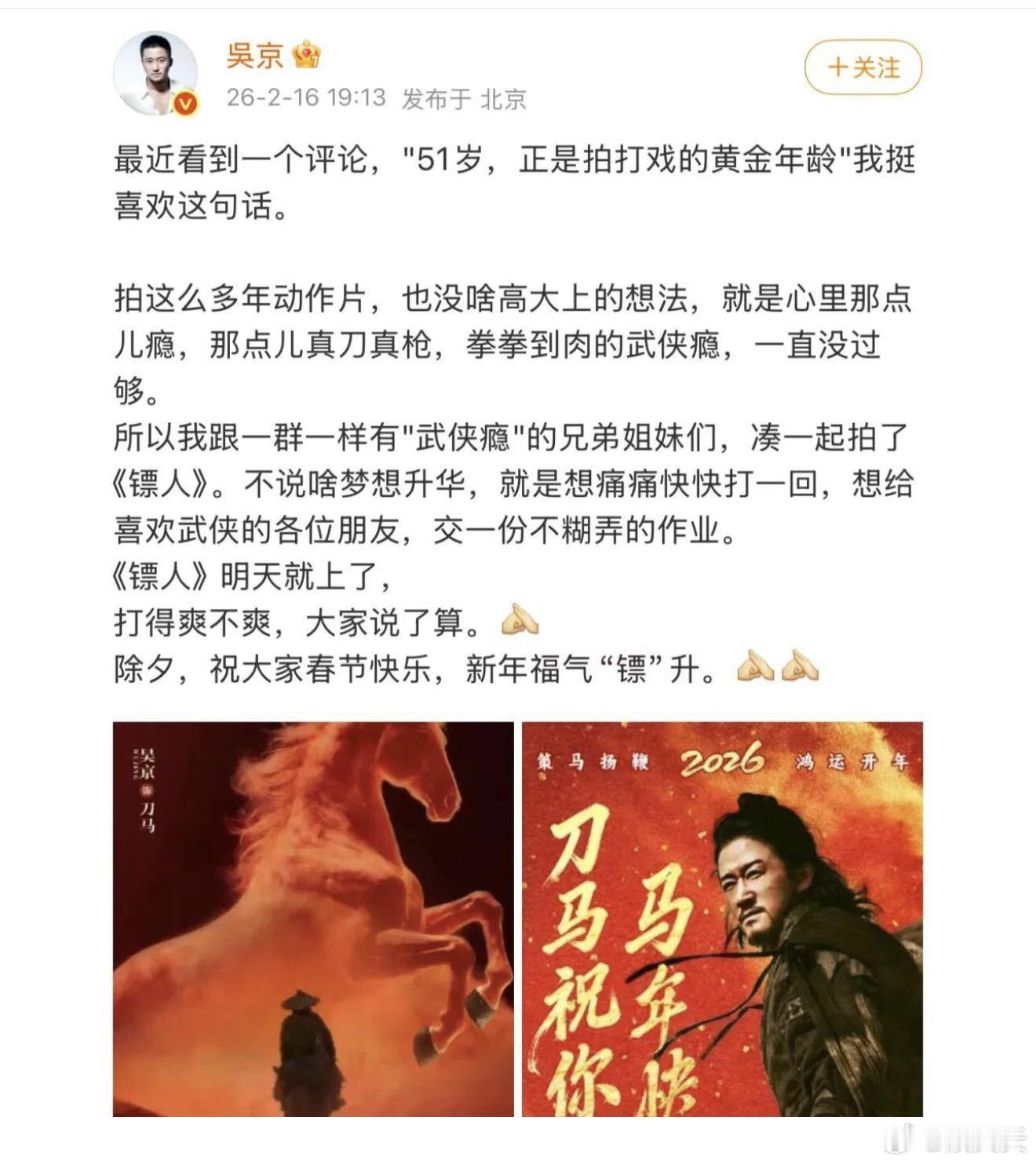 吴京好像专挑硬骨头啃 真的太佩服吴京了,永远在啃最硬的骨头。别人都躲着难拍的题材走,他偏要冲上去。从战狼到流浪地球,再到死磕武侠《镖人》,一直在拓荒,从不待在舒适区,这才是真正为中国电影开路的人。