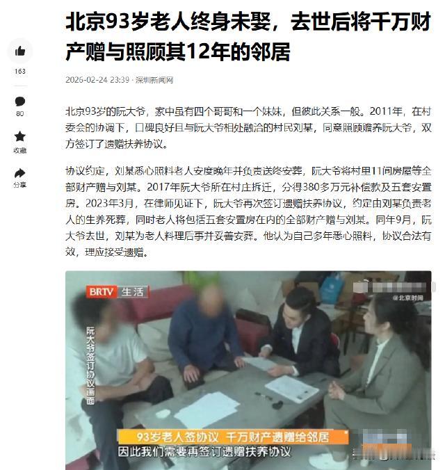 北京,93岁的阮大爷一辈子没成家,没儿没女,跟家里的兄弟姐妹也处得冷淡,平时就一个人独居,没人照看。2011年的时候,阮大爷年纪大了,行动越来越不方便,连个端水送药的人都没有,村委会看不过去,就从中协调,找了同村的刘某,让刘某负责照顾阮大爷的晚年生活,阮大爷也答应了,当场就和刘某签了遗赠扶养协议,约定以后自己村里的11间房,等自己百年之后都留给刘某。 本信息来源于:深圳新闻网、 没人知道,这份协议签完,后面会牵扯出这么多麻烦。 阮大爷独居惯了,刚开始还不太习惯有人在身边照顾,对刘某也带着点防备,平时花钱、办事都躲着刘某。 刘某没计较这些,不管阮大爷态度怎么样,每天按时上门,逢年过节也不落下,刘某照顾的比亲戚还周到。 就这么照顾了六年,到了2017年,村里赶上拆迁,阮大爷那11间房在拆迁范围内,最后核算下来,老人分到了380多万补偿款,还有五套回迁房。 这笔补偿款和房子下来后,阮大爷的日子宽裕了不少,但对刘某的态度,反倒更亲近了。 毕竟这六年,刘某从来没抱怨过,也没因为他脾气古怪就敷衍了事,实打实陪他度过了最难熬的晚年时光。 其实阮大爷心里跟明镜似的,自己的兄弟姐妹,自从他有了补偿款,偶尔会来看看他,说白了就是惦记他的钱和房子,平时他过得难的时候,没一个人露面。 2023年,阮大爷的身体越来越差,他知道自己没多少日子了,心里最惦记的就是刘某。 怕自己走后,兄弟姐妹来争抢财产,委屈了刘某,他特意又和刘某签了一份补充协议,明确把五套回迁房和剩下的补偿款,全都留给刘某,还找了村委会的人作证。 签协议的时候,阮大爷思路很清晰,说话也利落,全程都是自己的真实想法,没有任何人逼迫他,村委会的人都看在眼里,也在协议上签了字、盖了章。 同年9月,阮大爷安详离世,走的时候,脸上很平静。刘某按照当地的习俗,风风光光地给阮大爷办了后事,前前后后忙前忙后,花了不少心思和钱,比阮大爷的任何一个亲戚都用心。 刘某尽心尽力照顾老人十多年,拿到老人留下的财产,也是理所当然的事。 可没曾想,阮大爷的部分近亲属得知消息后,不乐意了。 他们说自己是阮大爷的亲戚,是法定继承人,刘某只是个外人,凭什么拿走五套房子和补偿款,还说当初签协议的时候,他们没参与,协议是无效的。 这些近亲属天天找刘某闹,要么要求分房子,要么要求刘某拿出补偿款,搅得刘某不得安宁。 刘某百般解释,说自己是按协议来的,可这些人根本不听,还扬言要把刘某告上法庭。 刘某也没怂,既然对方不讲理,那就只能靠法律来解决。 刘某主动提起诉讼,请求确认自己和阮大爷签订的两份遗赠扶养协议有效,判决五套回迁房的相关权益归自己所有。 法院找了村委会的人核实情况,还询问了村里的邻居,确认了刘某照顾阮大爷的全部事实。 遗赠扶养协议的效力,不需要近亲属参与确认。 根据民法典第一千一百五十八条规定,自然人可以与继承人以外的组织或者个人签订遗赠扶养协议。按照协议,该组织或者个人承担该自然人生养死葬的义务,享有受遗赠的权利。 本案中,阮大爷和刘某签订的两份协议,都是双方自愿的,没有欺诈、胁迫的情形,阮大爷当时具有完全民事行为能力,能清楚表达自己的想法,协议内容也不违反法律规定和公序良俗。 所以,不管近亲属有没有参与,协议都是合法有效的。 刘某只是个村民,不是法定继承人,真的能凭遗赠扶养协议,拿到老人的全部财产吗? 刘某已经全面履行了协议义务,依法享有受遗赠权利。 民法典明确要求,扶养人必须履行生养死葬的义务,才能享有受遗赠的权利。 刘某从2011年开始,照顾阮大爷长达12年,不管老人态度如何,始终尽心尽力,老人去世后,也是刘某料理的后事,完全履行了协议约定的全部义务。 所以,刘某有权按照协议,获得阮大爷的财产。 近亲属的法定继承权,不能对抗有效的遗赠扶养协议。 根据民法典第一千一百二十三条规定,继承开始后,按照法定继承办理;有遗嘱的,按照遗嘱继承或者遗赠办理;有遗赠扶养协议的,按照协议办理。 这就意味着,遗赠扶养协议的效力,优先于法定继承,哪怕近亲属是法定继承人,只要遗赠扶养协议有效,他们就无权争抢财产。 阮大爷的近亲属,在老人生前未尽任何赡养义务,只是在老人有了补偿款和房子后,才想来分一杯羹,这种行为既不符合道德,也不符合法律规定,法院当然不会支持他们的诉求。 最后法院判决,确认阮大爷和刘某签订的两份遗赠扶养协议合法有效,五套回迁房的相关权益,归刘某所有。 阮大爷一辈子不容易,无儿无女,幸好有刘某不离不弃照顾他十多年,给他养老送终。 那些平时不露面,老人走后就来争抢财产的近亲属,真的太让人不齿了。 法律不会辜负每一个善良的人,也不会纵容每一个投机取巧的人。 刘某凭自己的真心和付出,拿到应得的财产,无可厚非。