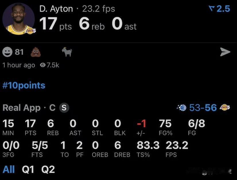 半场17分!艾顿让人眼前一亮! 今天,湖人队坐镇主场迎战魔术队。本场比赛,主力中锋艾顿的表现非常出色,上半场战罢,他已经8投6中高效得到17分6篮板,这样的半场表现让人眼前一亮。 进入赛季中后程,艾顿的表现越来越挣扎,一度被海斯抢掉了不少上场时间,本场比赛有望让他重新找回自信,继续成为那个熟悉的“两双机器”!
