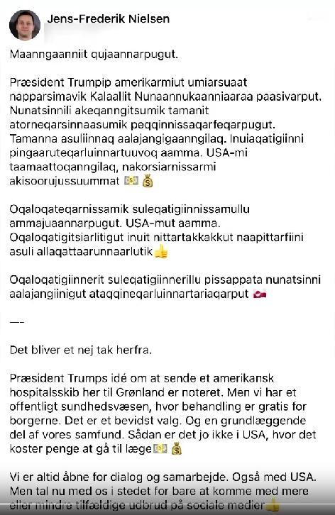 丹麦格陵兰岛总理尼尔森拒绝了特朗普的好意! 美国总统特朗普在社交媒体上说:“我们拟派送一艘医疗船到格陵兰岛帮助当地的居民看病。” 这话还没有落地,尼尔森在社交媒体上回应:“不,谢谢!” 尼尔森是聪明的,看透背后面的弯弯绕绕了。特朗普是看硬刀子不行了,就开始递软刀子了,可是大家都明白:特朗普的瓜吃起来容易,到时候想脱手的时候就“猫抓糍粑---脱不了爪爪”,毕竟特朗普翻起旧账来,可是不管不顾的。所以,尼尔森说“NO!” 众所周知,美国人自己看病是死贵死贵的,跑这么远来给格陵兰岛居民看病有那么好? 格陵兰岛居民免费的医疗不用,去看要花钱的,不知道特朗普咋想的???