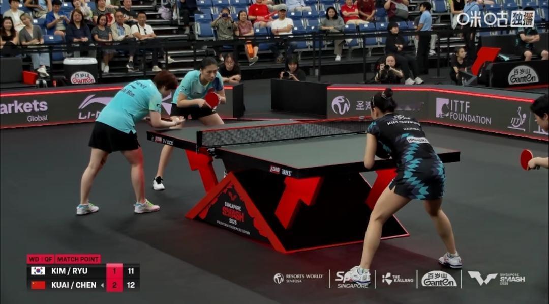 蒯曼/陈熠女双比赛,荡气回肠的从3-10到13-11! 新加坡大满贯赛女双1/4决赛 蒯曼/陈熠3:1(11-7;9-11;12-10;13-11)险胜赛会1号种子韩国金琴英/柳韩娜! 众所周知,蒯曼/王曼昱是双打排名世界第一! 而蒯曼/陈熠组合时长不长! 说到底,这场比赛有点让人惊心动魄! 第2局,领先,被追到9平而告负! 更别说第4局,3-10落后! 好在永不言弃,挽救了7个赛点,到10平! 这场比赛肯定的是胜利! 但也要总结磨合配合问题! 率先结束的另一场1/4决赛 日本张本美和/早田希娜3:0(11-6;11-9;11-9)零封东道主黎嬣萱/黎明映。 上半区女双半决赛,中日对决赛。 蒯曼/陈熠Vs张本美和/早田希娜 加油国乒小将!