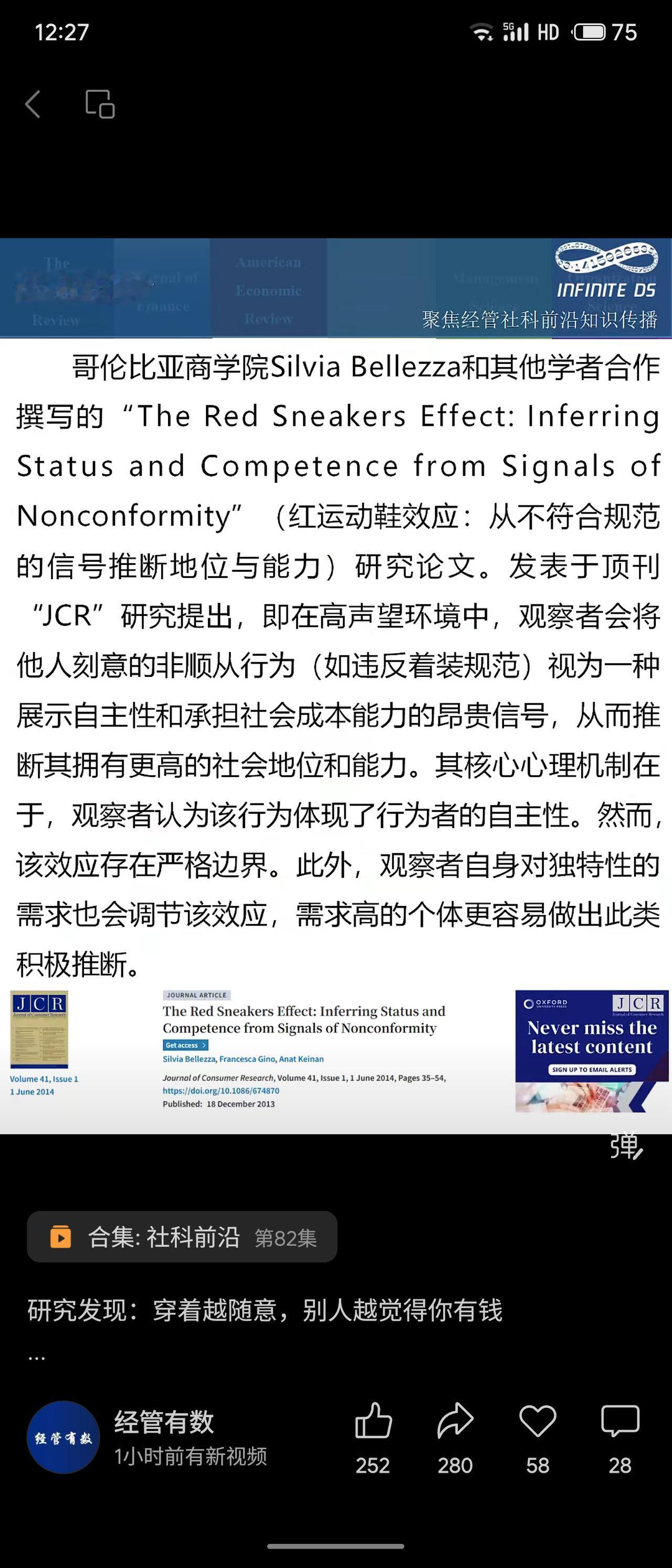 一项由哥伦比亚商学院学者发表于《Journal of Consumer Research》的研究提出了“红运动鞋效应”:在高声望环境中,刻意违反着装规范等非顺从行为,会被视为彰显自主性和承担社会成本的信号,从而让观察者推断其拥有更高的社会地位和能力。 该研究的核心贡献在于揭示了非顺从行为在社会认知中的信号价值。它并非鼓励随意穿着,而是点明了社会判断的复杂性:效应成立需严格满足观察者熟悉情境、行为是刻意为之、环境存在明确规范等边界条件。这为理解消费行为和身份信号提供了新视角。
