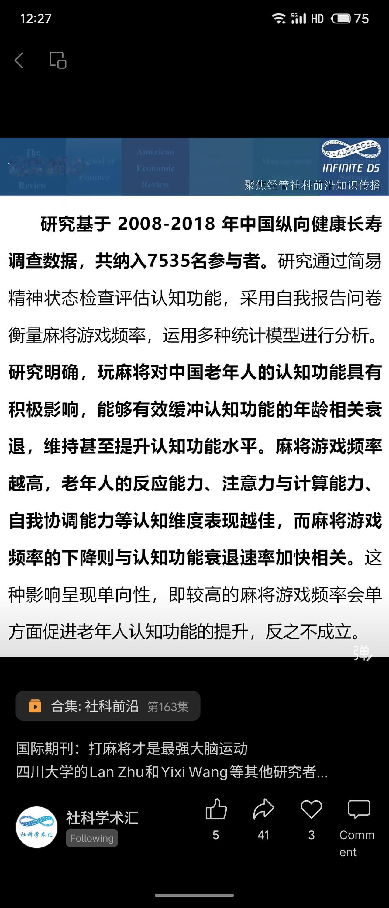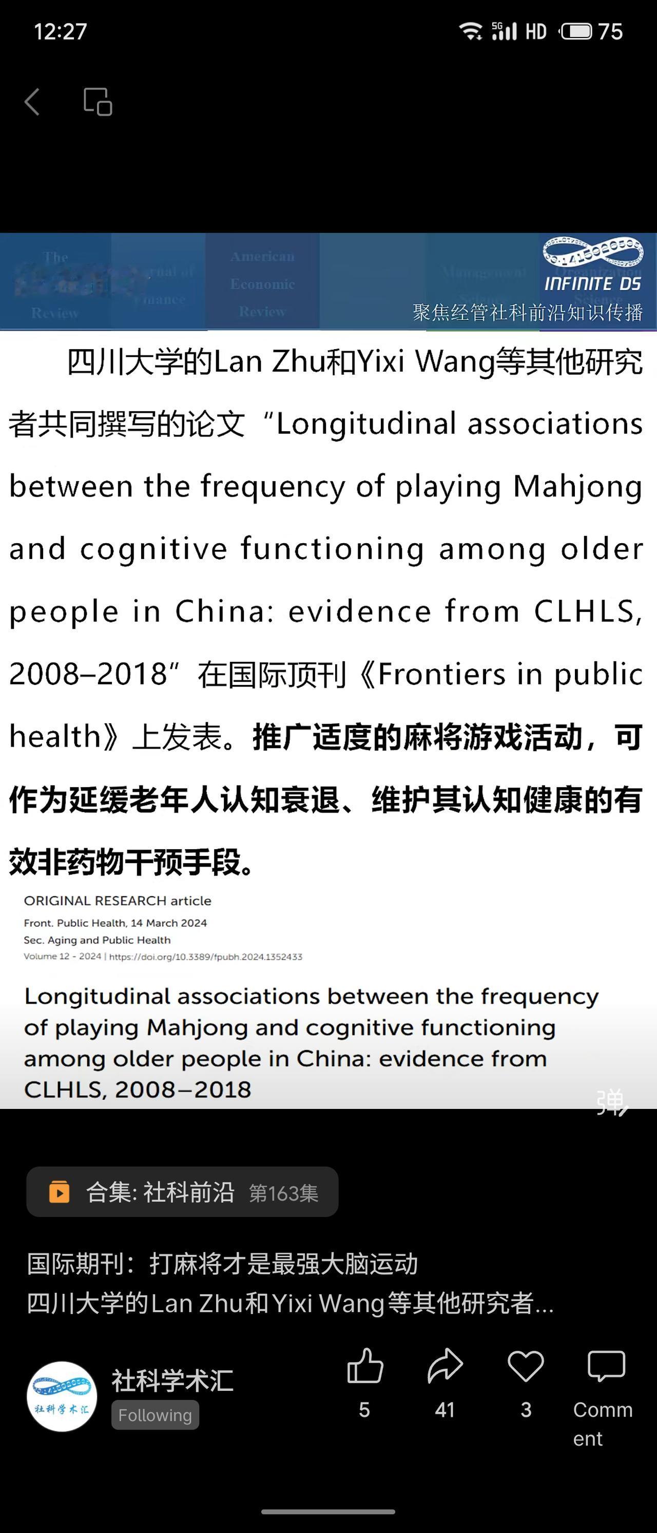这是一项由四川大学学者发表于《Frontiers in Public Health》的研究,基于2008—2018年全国纵向调查数据,分析了7535名中国老年人打麻将频率与认知功能的关系。 研究发现,打麻将频率越高,老年人的认知表现越好,能有效缓冲年龄相关的认知衰退。这种影响是单向的:玩麻将会促进认知健康,反之则不成立。研究提倡将麻将作为延缓老年人认知衰退的非药物干预手段。 这项研究有三大亮点:一是采用十年纵向数据,因果推断力强;二是关注日常文化活动,拓展了认知健康干预的视野;三是结论贴近生活,具备较强的实践推广价值。