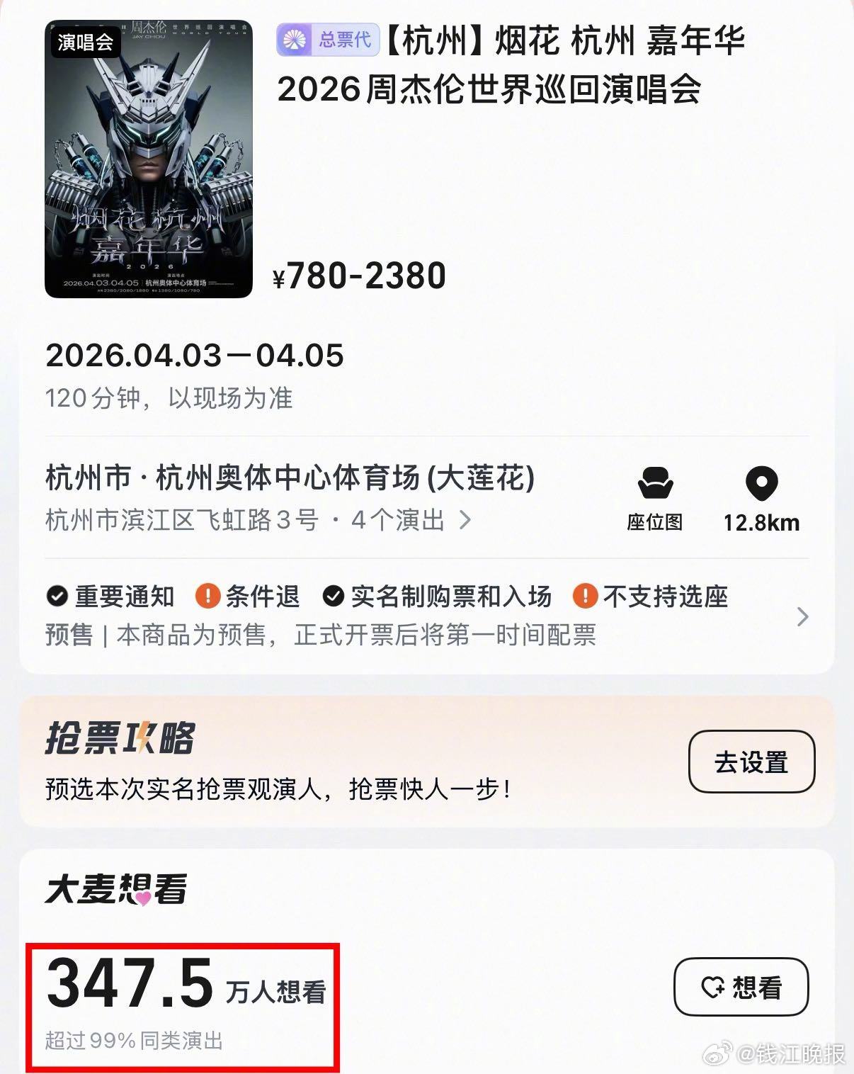 据不完全统计,截至发稿,本次演唱会仅大麦平台“想看”人数就轻松突破347万大关。正式开售后, #周杰伦杭州演唱会门票# 的话题也迅速霸榜社交媒体热搜。