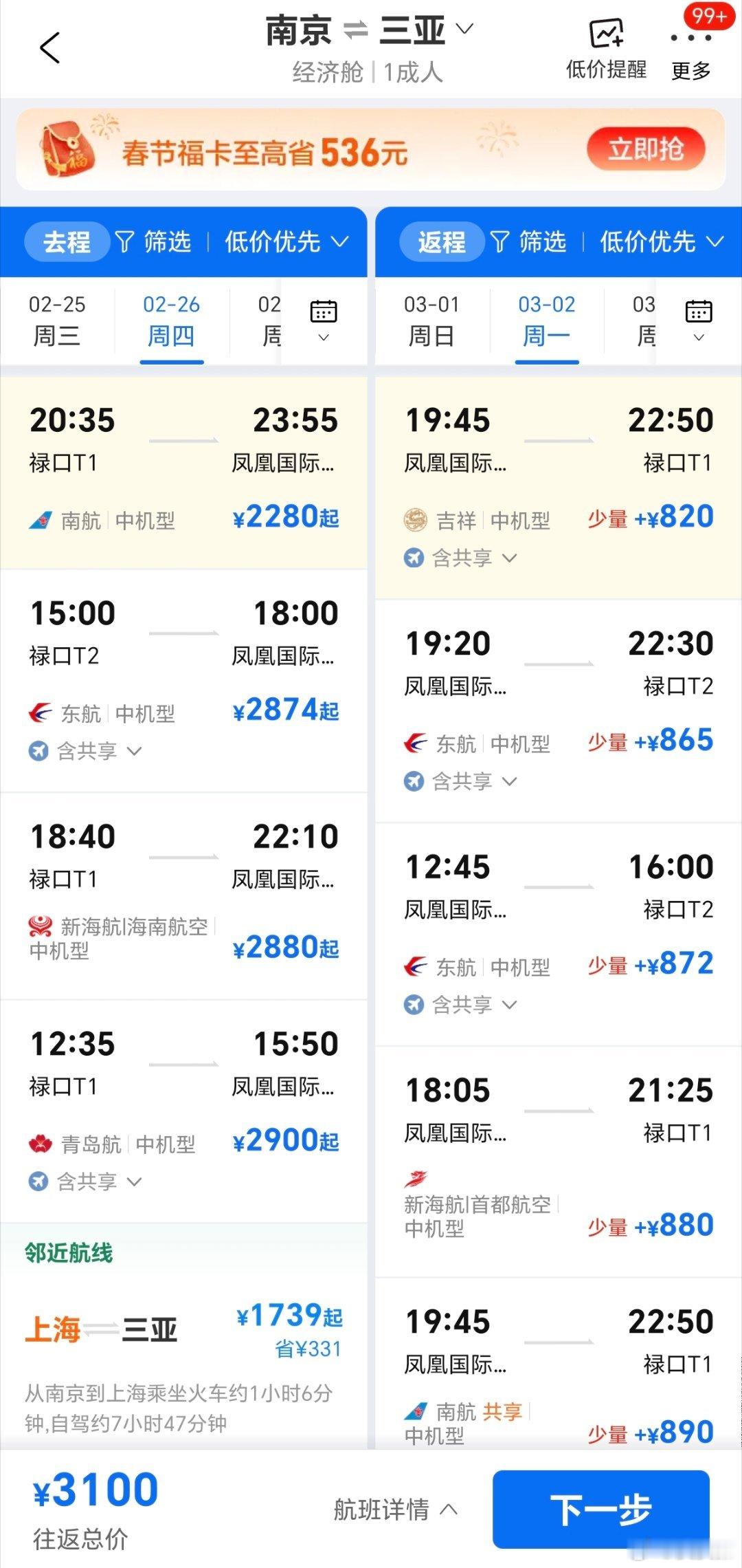 海南涌现大量1折机票刚看了一眼南京飞往海南三亚明天的机票价格,去程6910元,如果选往返来回也要3000多,这价格也没便宜多少啊。 科技先锋官