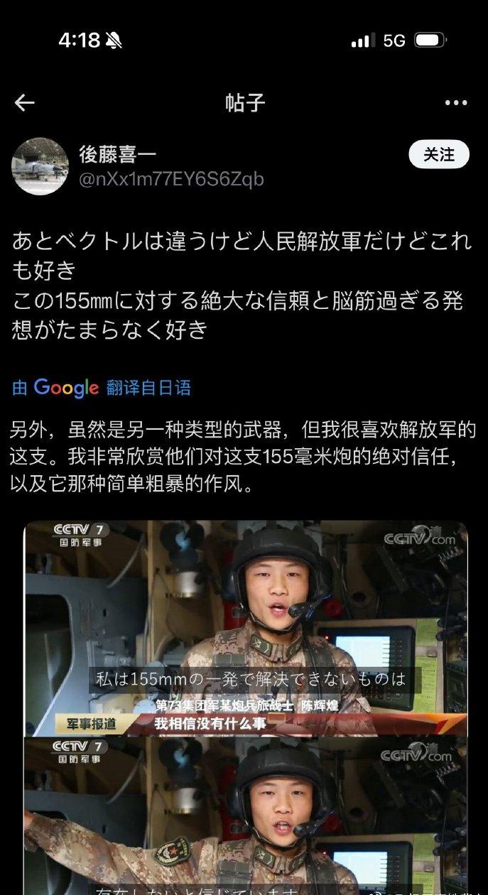 解放军战士在日本推圈爆火,原因竟然是因为一句话! 这位战士面对镜头,没念稿子,也没喊口号,就是用一种特别平常的语气说了一句:“我相信没有什么事情是一发155毫米炮弹解决不了的,如果有,那就再来一发。” 这段视频并非官方刻意发布的宣传素材,只是战士在日常训练间隙,被偶然拍到的随口回应。让人意外的是,爆火的范围不仅限于日本推圈,还扩散到了日本不少社交平台。 有一部分日本网友觉得这句话太过“强硬”,甚至出言质疑,可更多的人却被这份直白又自信的态度打动。 有人直言,比起那些绕弯子的官方话术,他们更喜欢解放军这种不遮不掩、简单直接的作风,还有人感慨,这种从容的底气,绝不是装出来的,背后一定有实打实的实力支撑。 还有日本网友特意去查询了155毫米炮弹的威力,看完相关数据后,更是直言难怪战士能说出这样的话,这份自信有理有据,让人无法反驳。 155毫米炮弹是解放军陆军远程压制火力的核心装备,威力大到超乎想象。 这种炮弹单枚重量就有几十公斤,里面装的炸药能轻松摧毁坚固的野战工事,就算是废弃的车辆,被一发155毫米炮弹击中,也会瞬间被火球吞没,碎片能飞到几十米高空,杀伤范围能覆盖一整个足球场,就算是隐蔽在地下的简易工事,也能被轻松击穿。 而且中国的155毫米火炮技术已经非常成熟,不管是陆军的自行火炮,还是即将装备海军的新型舰炮,在射程、精度和威力上,都处于世界领先水平,射程能轻松突破百公里,精准度更是能控制在几米之内。 最有意思的反差是,就在这位解放军战士因155毫米炮弹的话语爆火时,日本正在费劲心思升级自己的155毫米火炮。 据悉,日本近期正在推进陆上自卫队155毫米火炮的远程化升级,还特意从国外引进技术,试图将火炮射程提升到150公里,可即便投入大量精力,他们的155毫米火炮在威力、精度和稳定性上,和中国的相比仍有不小差距。 更尴尬的是,日本自卫队之前还发生过155毫米炮弹误射事件,训练时因为误装两倍火药,导致炮弹飞进训练场以外的山林,最后出动600多人搜寻,高官还得鞠躬道歉,这样的狼狈,和解放军战士的从容自信形成了鲜明对比。 这段视频传到国内后,也迅速走红,网友们纷纷为这位战士点赞。大家都清楚,战士的这句话,不是狂妄自大,而是对自身实力的绝对信任,更是对国家国防力量的底气所在。 中国军人从不主动挑衅任何人,可也绝不畏惧任何威胁,我们发展国防力量,不是为了称霸,而是为了守护国家的和平与安宁,守护亿万国人的幸福生活。 155毫米炮弹的威力,从来都不是用来炫耀的资本,而是用来抵御外敌、捍卫主权的底气。 这位解放军战士能在日本推圈爆火,本质上不是因为一句话有多“霸气”,而是因为这句话背后的实力,以及中国军人不卑不亢、从容自信的态度。 在这个充满不确定性的时代,这份直白的自信,打破了很多人对中国军人的固有印象,也让更多人看到了中国国防的强大。 比起那些华丽的口号,这种朴素又坚定的表达,更能打动人心,也更有说服力。
