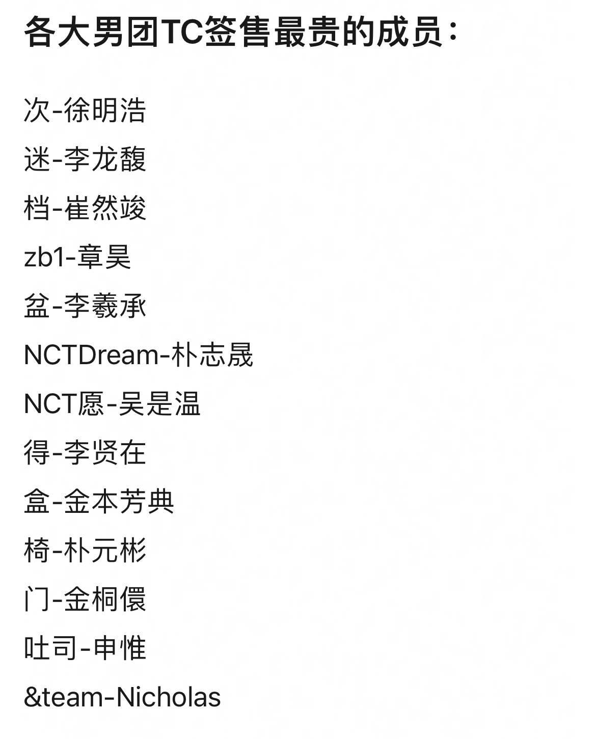 各大男团国内签售最贵的成员:次-徐明浩 迷-李龙馥 档-崔然竣zb1-章昊 盆-李羲承nctdream-朴志晟 nctwish-吴是温得-李贤在 盒-金本芳典椅-朴元彬 门-金桐儇吐司-申惟 &team-Nicholas