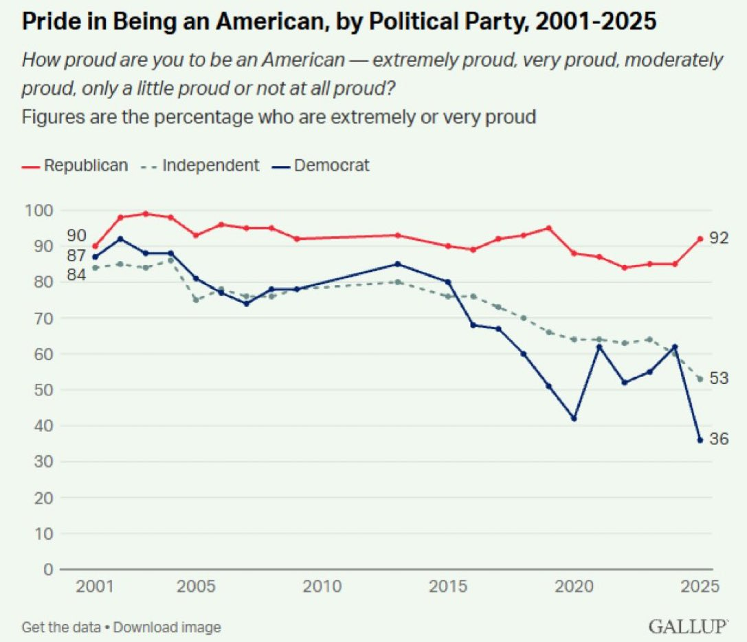 如今的共和党人比2000年时更以身为美国人而自豪。不过,民主党人的情况却发生了非常奇怪的变化,不管是共和党还是民主党执政都让民主党人更讨厌美国
