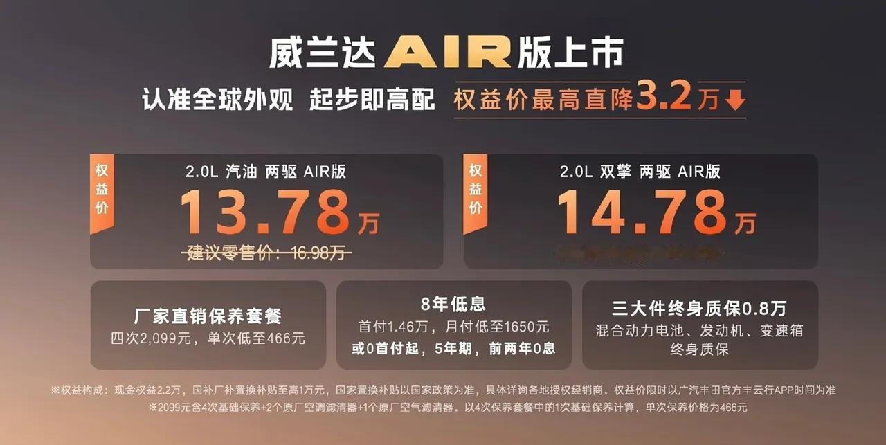 不管你信不信,这就是事实! 2021年,卡罗拉全球销量115万辆 2022年,卡罗拉全球销量112万辆 2023年,特斯拉model Y 全球销量122.3万辆 2024年,丰田RAV4全球 销量118.7万辆 2025年,丰田RAV4 全球销量128万辆 过去10年,丰田有9年拿下全球单一车型销冠 。可以说在全球范围内来看,丰田汽车还是最受欢迎的,轿车有卡罗拉,SUV有丰田RAV4。 威兰达AIR权益价13.78万 RAV4是一款全球车型,在中国这边分为一汽丰田RAV4和广汽丰田威兰达。最近广汽丰田威兰达放大招了, 2.0L汽油版权益价只要13.78万元可以说真的太合适了。 高级皮质座椅、真皮方向盘、外后视镜电动折叠加热、50W快速充电, 64色氛围灯等配置以前要加钱才能升级,现在全部标配。TSS 4.0智能驾驶辅助系统,L2级辅助驾驶全系标配。 13.78万还送动力系统终身质保,让用户得到更大的实惠,也是对自己质量保障的信任。