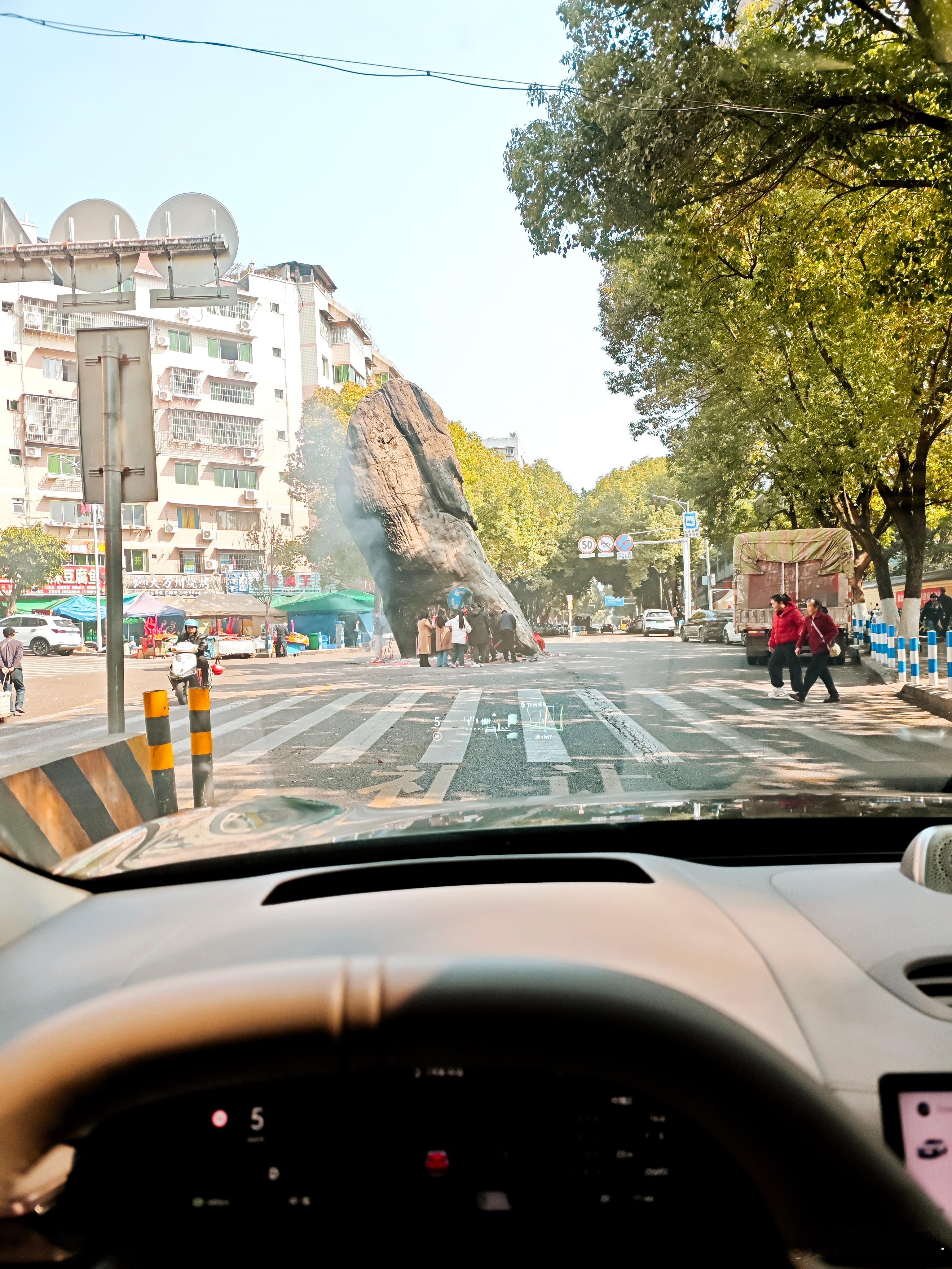 从重庆万州返回西安专门跑去看了一眼传说中的青龙石,结果比我想象的还要大😂,就杵在马路中间,车都得绕着走,不少人都在这里烧香,石头都熏黑了,本地人说是"动不得的石头"。据说当年想移走都发生了很多诡异的事件,科学的尽头确实是玄学。 重庆·万州区