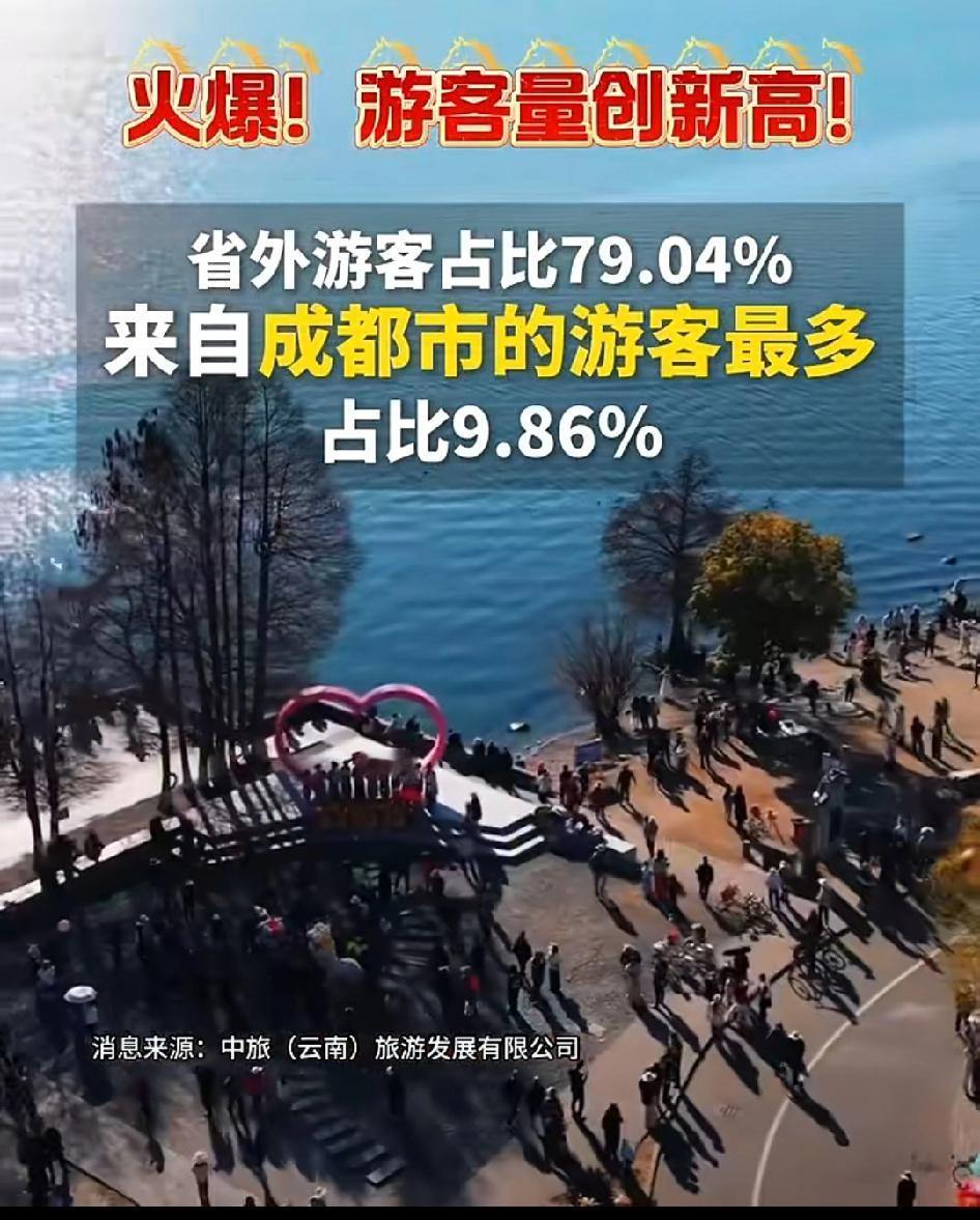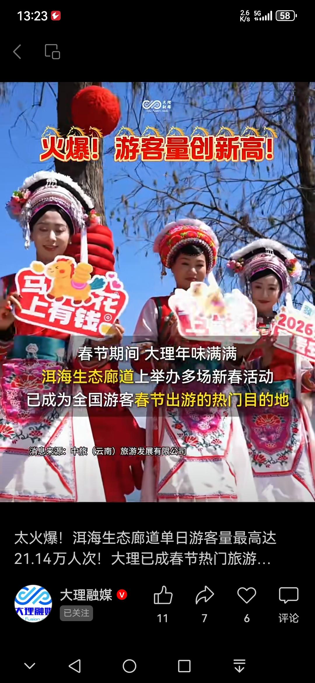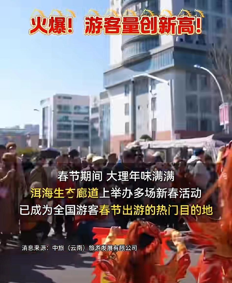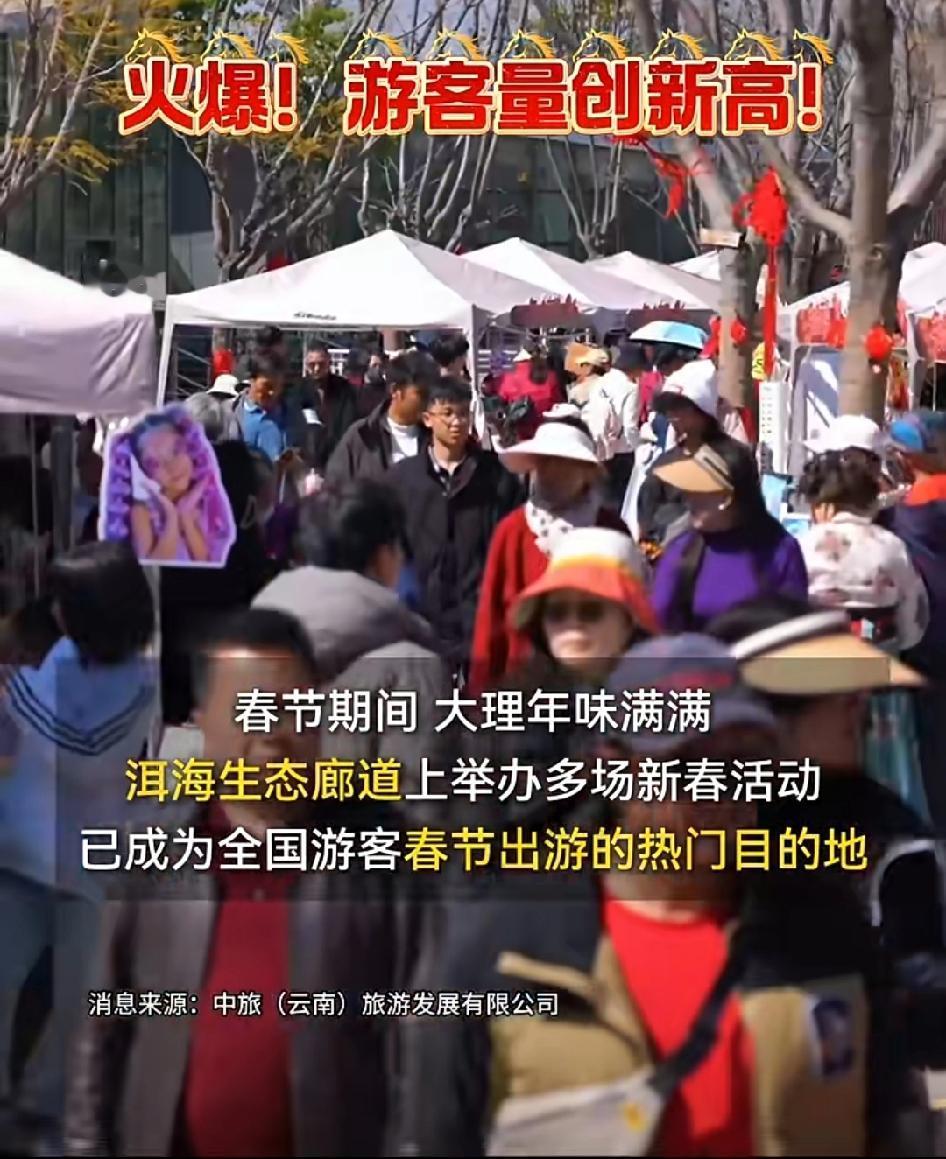 大理今年春节旅游太火爆啦!洱海生态廊道单日游客量最高达21.14万人次,春节累计接待人次破百万,日均客流量13.6万,省外游客占比约74.05%。 为应对客流,洱海生态廊道增加运营人员,提前检修交通载具,提供多种交通服务。期间还组织“Hello大理 2025新春韵”活动,奇幻山海经巨型提线木偶戏超吸睛。 除了洱海生态廊道,大理其他景区也人气爆棚。古城人潮涌动,鸡足山热度持续,各景区还推出特色活动,像崇圣寺三塔的白族舞龙、天龙八部影视城的开城门迎宾,让游客尽享非遗版春节的魅力。