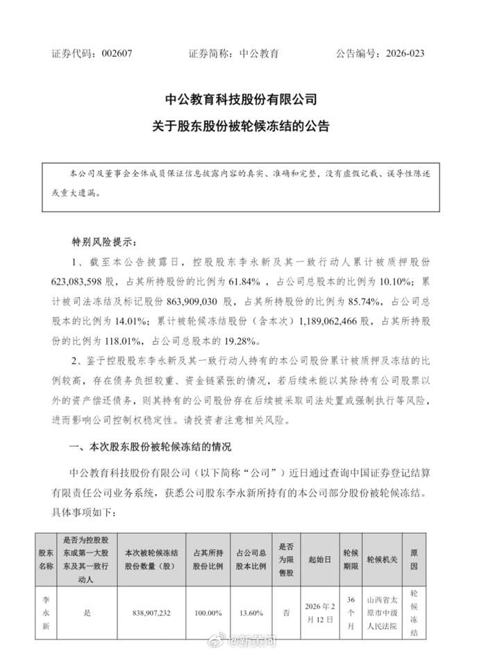 【#中公教育创始人全部股份被冻结# 】2月24日晚,中公教育(002607.SZ)发布公告称,公司控股股东、创始人李永新所持8.39亿股股份首次被100%轮候冻结,占公司总股本13.60%。所谓轮候冻结,简单理解就是债主在排队等着冻结股权,一旦前面解冻后面的立即生效。而冻结原因为借款担保纠纷,涉案金额约6422.18万元。