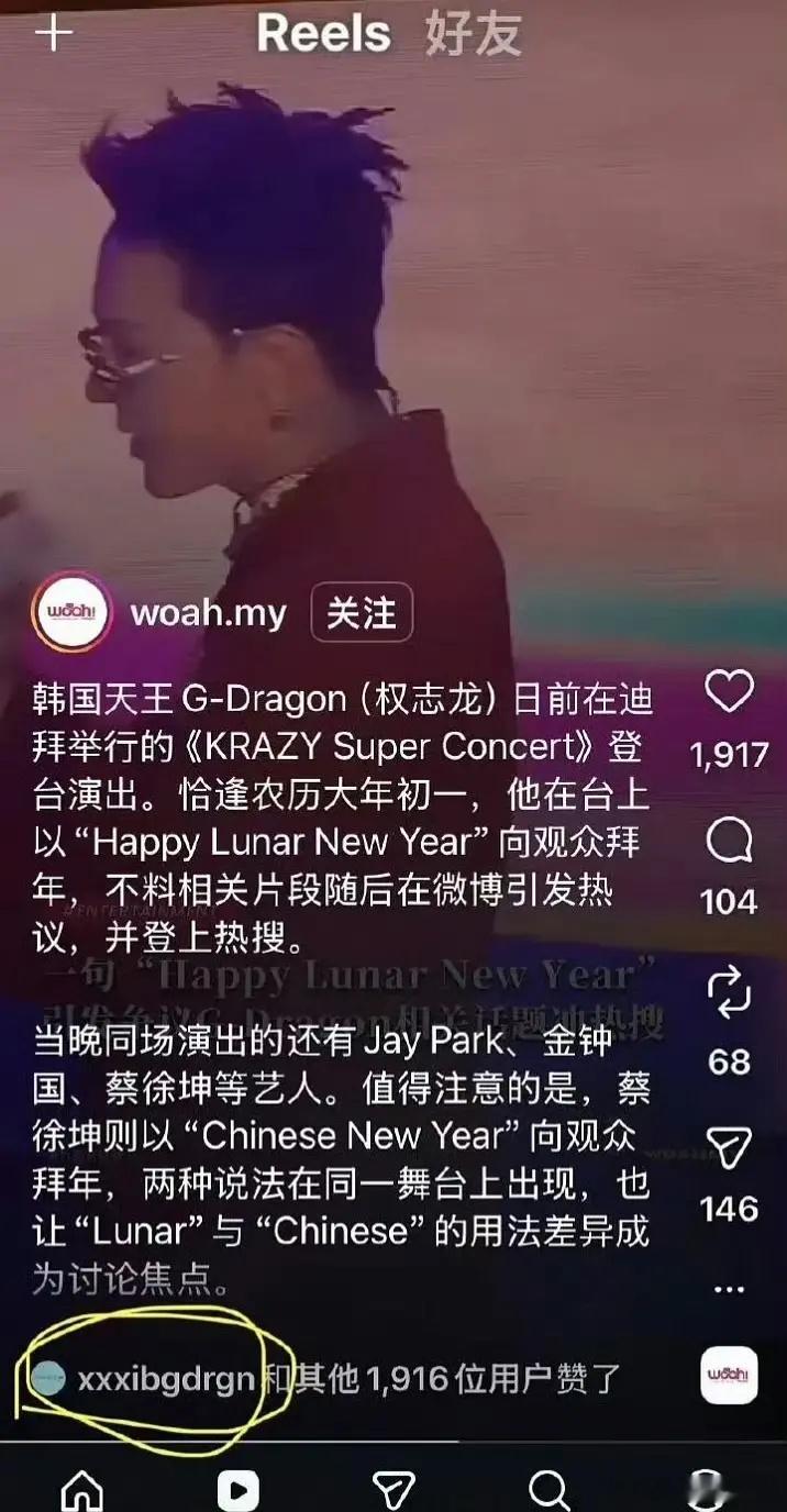 权志龙点赞了好几个自己说lny的视频视频提及了他本人说lny,以及蔡徐坤同台说cny