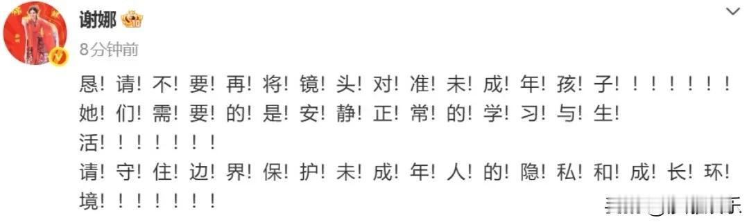 谢娜,愤怒发文! 提起谢娜,咱们脑海里蹦出的总是那个在舞台上嘻嘻哈哈、带给咱们无数快乐的“太阳女神”。2月25日,她却在社交平台连发多个感叹号,字里行间满是无奈和恳切,只为了求一件事:请不要再把镜头对准她8岁的双胞胎女儿 。 事情是这样的,2月25日,有八卦媒体拍到谢娜带着跳跳和俏俏去上课的画面。说实话,看照片里俩小姑娘扎着同款小辫儿,背影都是满满的孩子气。可就是这组照片,让谢娜破防了。 刚刚,谢娜发文呼吁,恳请所有拍摄者“守住边界”,保护未成年孩子的隐私。说实话,看完她的发文,我心里挺不是滋味的。咱们换位思考一下,如果你接送孩子上下学,总有陌生人拿着“长枪大炮”怼着孩子脸拍,你怕不怕?你急不急? 谢娜作为公众人物,享受了光环,但她那两个才8岁、正在无忧无虑长大的孩子,没理由连出门上课都要活在镁光灯下 。 其实翻翻谢娜的社交动态,她对这两个孩子有多保护,大家有目共睹。她分享过给孩子策划生日惊喜的温馨,也记录过教孩子乐观面对生活的点滴,但从来都是用文字或背影来传递爱,坚决不让孩子的正脸曝光。为啥?因为她知道,舆论是把双刃剑,她想给孩子的,只是一个干干净净、不被围观、不被评头论足的童年。 这事儿也给我们提了个醒:在流量为王的时代,除了“拍得到”,是不是更该想想“该不该拍”?明星也是妈,孩子更是无辜的。 希望那些镜头能自觉往后退一步,别让这份爱,变成对孩子和家人的打扰。守住那份边界感,或许才是对谢娜一家最好的尊重。大家觉得呢?