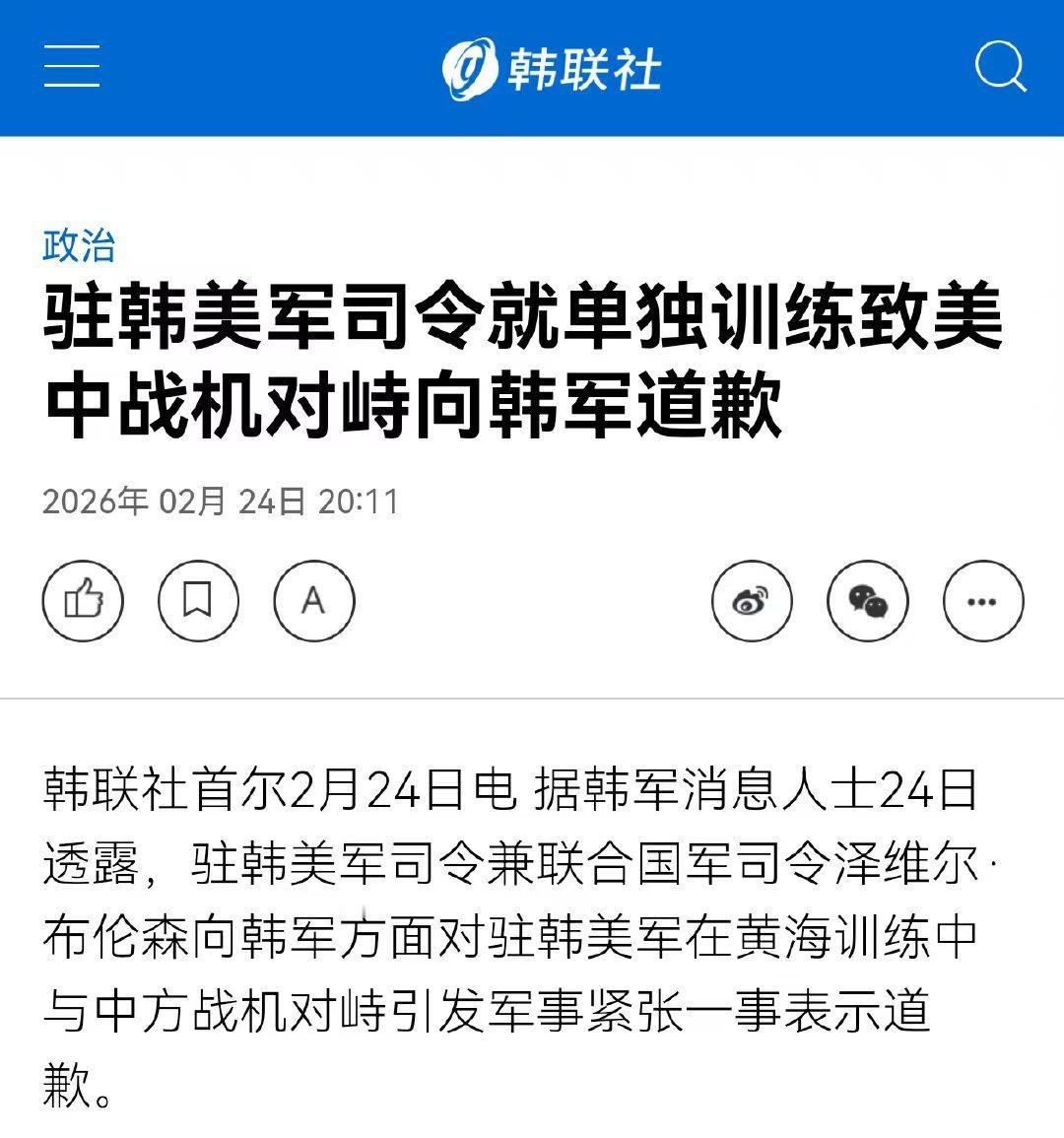 驻韩美军司令真的对韩国道歉了? 真的是倒反天罡了,这是第一次道歉吧?驻韩美军司令兼联合国军司令布伦森,向韩军方面表示道歉。原因是美国空军在黄海东侧训练中,与大国战机对峙,结果美军对峙还输了,这搞得美国空军很没面子。结果韩国方面怒了,要求美军道歉。原因是美军擅作主张,引发局势紧张。 当韩国公布这一消息后,韩国《每日经济》再次报道:驻韩美军司令官兼韩美联合司令官布伦森向韩军当局致歉一事,予以强烈反驳,该报道仅内容部分属实。 所以驻韩美军司令到底是道歉,还是没道歉,这就很尴尬了。韩国方面先是表示收到道歉,结果后面又说不道歉,这里边有多么激烈的博弈和对峙,这就不好说了。如果真的道歉,这也是破天荒的第一次。 估计是不是先道歉,后来发现用词不妥,然后又紧急收回道歉,也有这种可能。反正现在是驻韩美军司令的问题,肯定是被各种的压力过来了。现在情况下,驻韩美军主要是用来防范三八线上的安全问题,而不是四处找茬,挑动地方局势的。 韩国方面对美国空军的挑衅,自然很愤怒,所以要求驻韩美军道歉,结果驻韩美军司令一开始还真的表示了道歉。后来似乎准备收回道歉,肯定有多方的压力,在迫使驻韩美军司令做出改变,估计是美国内部的压力。 不管怎么说,韩国媒体先是表示驻韩美军司令道歉,就说明确有其事。后续不道歉,或者是收回道歉声明,就存在激烈的博弈。不过道歉和不道歉,韩国这次都赢了,至少压着驻韩美军司令作出了表态,说明韩国是有点实力的。