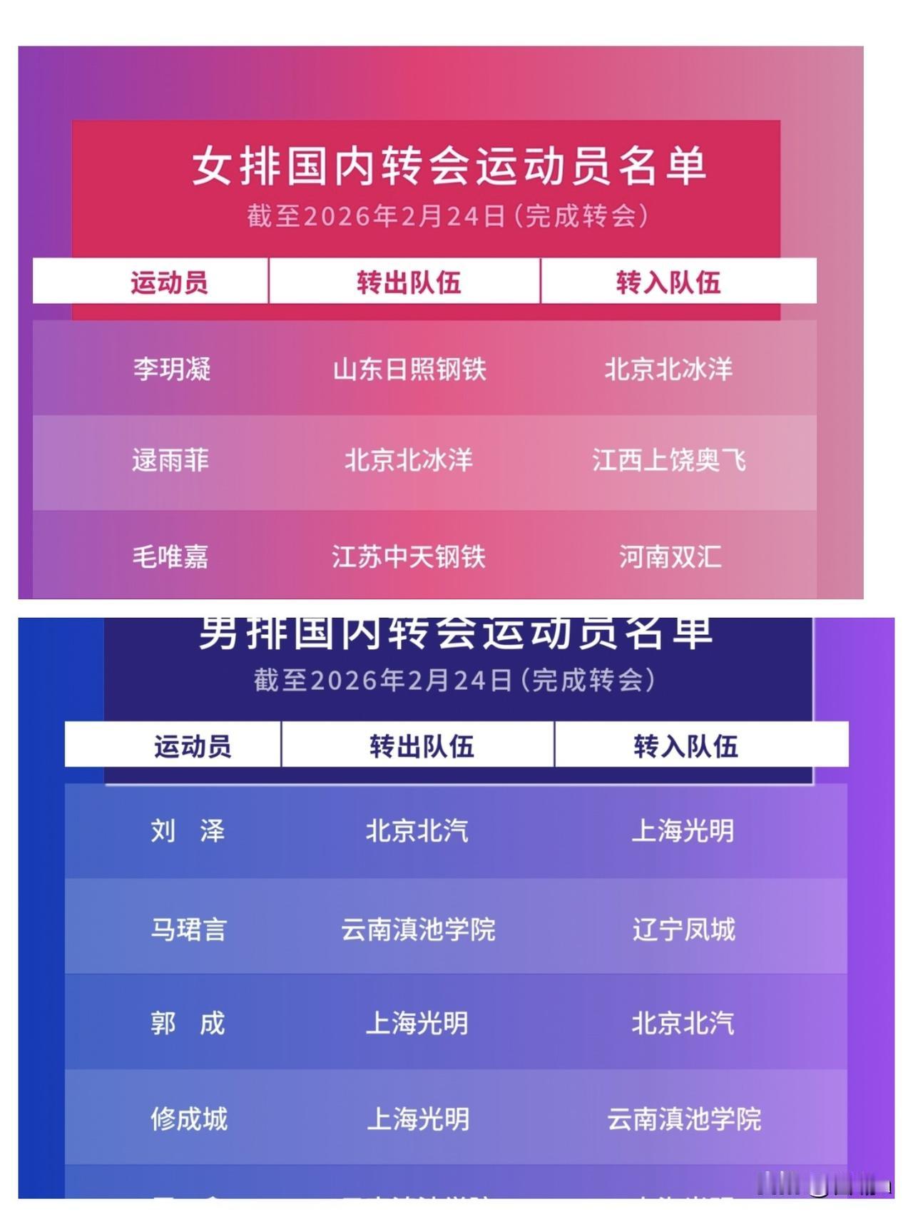 排球超级联赛今天女排率先开打,新年后部分俱乐部内援转会! 女排方面: 带领山东U20女排全运会夺冠的主二传李玥凝正式转会北京女排,李玥凝本就是山东从四川挖掘过来的,全运会后原本以为她会升到一队和解盛钰共同担起山东二传位置,可是联赛伊始,她却神秘消失,坊间传闻她离开山东去北京投奔恩师匡琦去了,之后王云蕗也多次晒出她在北京的合照和互动,这次正式转会也证实她的出走。另外北京女排提携新人,逯雨霏没有位置被转会江西女排,而苏青副攻毛唯嘉因为队里有小将郭中楠横空出世,也是打不上球被转会河南。 男排方面: 北京和上海二传互换,郭成去了北京可以打上球,而刘泽去上海弥补主二传于垚辰不足同时,也可以和女友许晓婷团聚,上海从教练到队员全力支援云南,云南成了上海二队,B级表现出色的攻手周鑫被召回一队,同时上海补给了云南修成城,云南也把马珺言转会给了辽宁,辽宁也是缝缝补补继续前行。女排 中国女排超联赛 山东u20女排 北京女排 中国男排超级联赛 上海男排