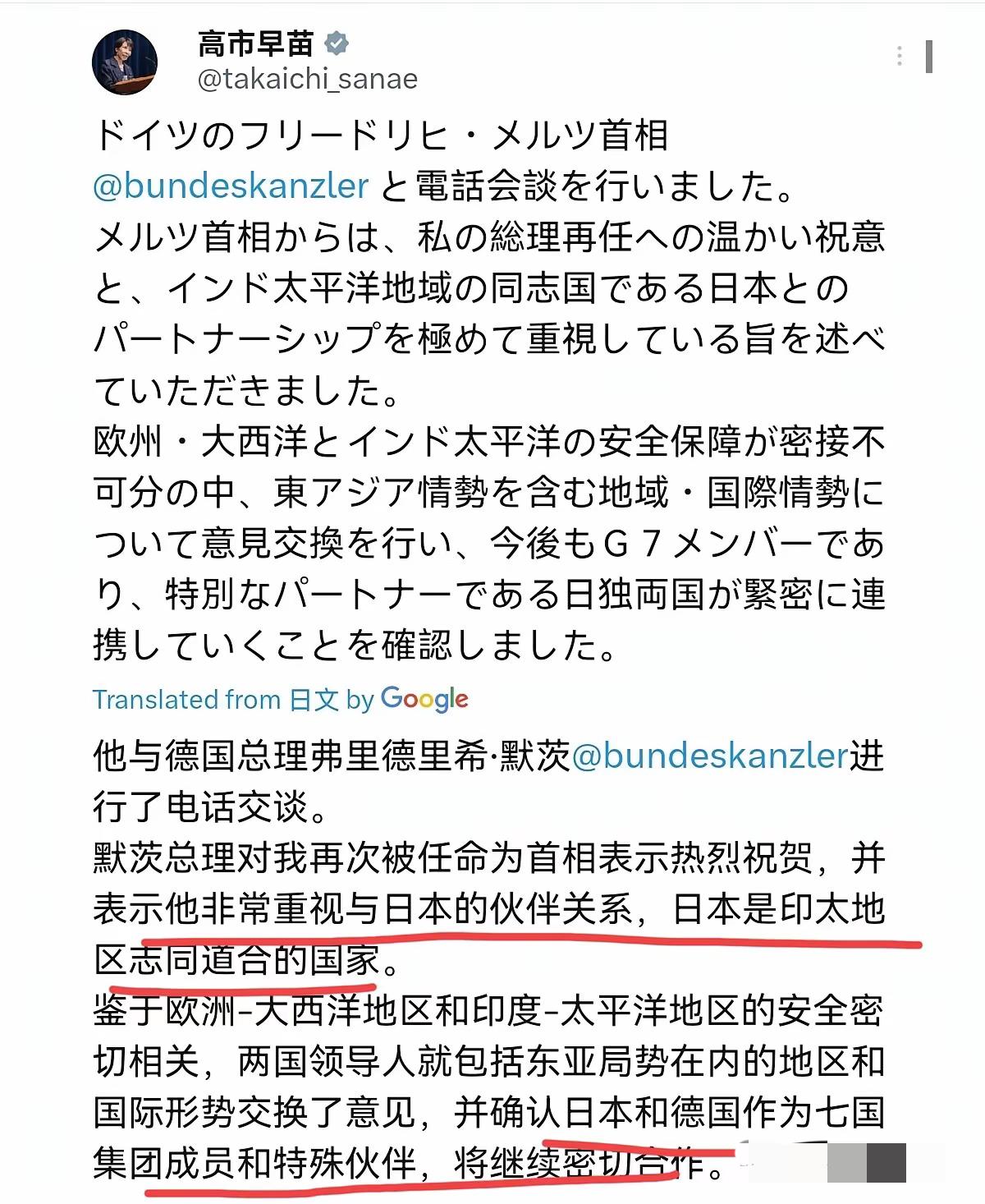 德国算盘打的是真精!中国刚对日本进行反制,德国总理动身访华当天,默茨卡点与高市早苗进行通话。而在德日两国领导人通话之后,2月24日,高市早苗表示,我与德国总理弗里德里希·默茨进行了电话会谈。默茨总理就我再次就任首相表示热烈祝贺,并表示,高度重视日本作为德国在印太地区的志同道合伙伴国之间的合作关系。 默茨这通电话,时间点选得确实“刁钻”。就在他启程访华的同一天,特意抽出25分钟跟高市早苗聊上了。这可不是简单的“例行公事”,而是德国在玩一场高难度的外交平衡术。说白了,默茨是想告诉全世界:我来中国谈生意,不代表我忘了“西方阵营”的规矩,更不代表我会在安全议题上跟中国走得太近。 德国人这次访华,说白了就是冲着钱来的。默茨这次可不是一个人来的,他身后跟着一支“豪华天团”——大众、西门子、宝马、阿迪达斯等30多家德国巨头的CEO都来了。这架势,摆明了就是来中国“扫货”的。德国经济现在被美国的高关税搞得焦头烂额,急需中国这个庞大的市场来救命。默茨心里清楚,跟中国搞好关系,德国企业才能活下去。 但德国人又不想“吃相太难看”。他们既想赚中国的钱,又不想被贴上“亲华”的标签。所以,默茨在出发前特意给高市早苗打了个电话,意思就是:你看,我跟日本还是好兄弟,咱们在印太安全上还是站在一起的。这种“既要又要”的心态,正是德国目前外交困境的真实写照。 高市早苗这边,也是“借坡下驴”。她刚被中国反制,正愁没地方找补呢,默茨这通电话简直是“雪中送炭”。她赶紧抓住机会,强调德日“志同道合”,还特意提到“印太安全”。这明显是在给中国上眼药,暗示德国在安全问题上还是站在日本这边的。 不过,默茨这招“左右逢源”能不能奏效,还得看中国的态度。中国现在可不是好糊弄的,你想来赚钱,就得拿出诚意。如果德国一边赚着中国的钱,一边又在背后搞小动作,中国肯定不会买账。默茨这次访华,能不能带回真金白银,还得看他能不能在中德之间找到真正的平衡点。 各位读者你们怎么看?欢迎在评论区讨论。