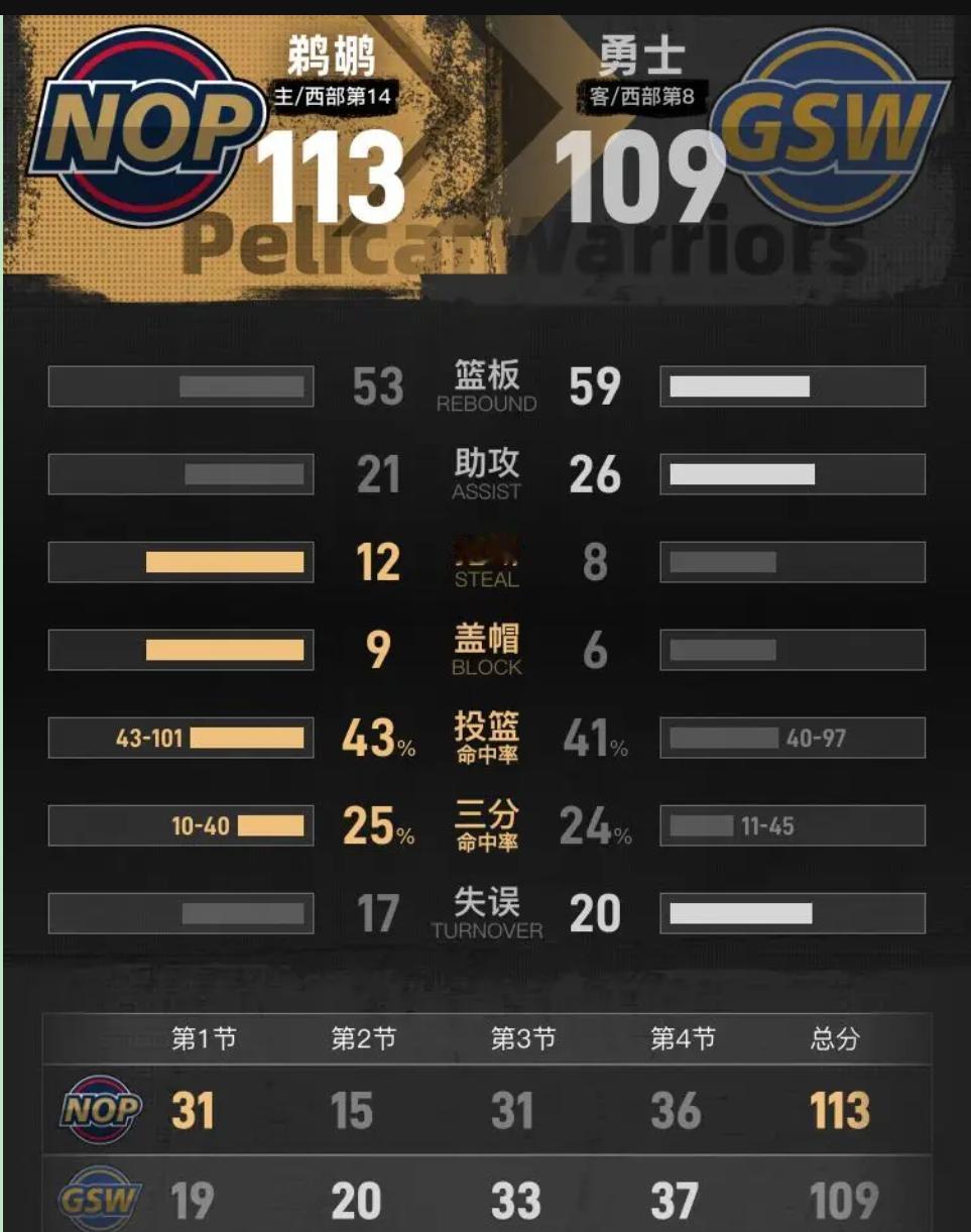 你看着梅尔顿28分穆迪24分,是不是觉得勇士未来可期?别急着鼓掌,这场输球就像你刚修好的美颜相机——看着光鲜,一拍就死机。 第四节最后五分钟,鹈鹕那波12-4打下来,我手里的可乐都温了。蔡恩冲进来那一下,勇士内线跟早高峰的地铁闸机似的,人多但没用。梅尔顿穆迪数据刷得跟直播带货的GMV一样吓人,可关键时刻球在谁手里?格林硬塞失误,桑托斯强投打铁,这哪是打篮球,这是各自扫码付款,谁也不理谁。 科尔叫暂停时脸都绿了。我看球这些年懂一个道理:助攻数不会骗人。鹈鹕25次传导像运河开闸,精准有方向;勇士21次看着不少,但全停在单打手里。水多了不疏通,淹的只能是自己家的田。 威廉森就26分,但个个钉在七寸上。勇士追到差3分,他立马一个2+1把你摁回沙发。这种憋屈,懂球的人都懂——你有三条支流哗啦啦响,人家一条河道直通入海口。 重建期最怕什么?不是缸里没水,是水在乱撞。这场113-109就是一盆及时的冷水。年轻人需要这种痛,河道需要清淤。数据再漂亮,赢不了球就是旱季泛滥,冲垮自家田埂。但看清了窟窿在哪,下一次雨季,才能真的长出庄稼。波杰姆斯基16+15威廉森26分 勇士不敌鹈鹕