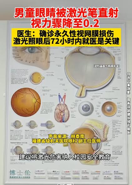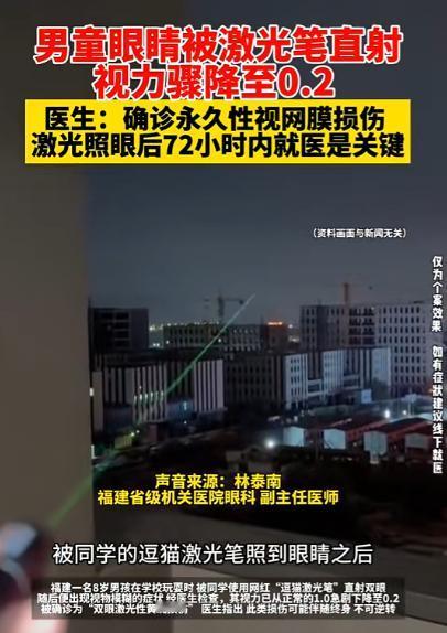 “悲剧还是发生了!”近日,福建泉州,一8岁男童和同学玩耍时不小心被同学用激光笔照了一下眼睛,而后就出现了短暂的黑影,检查后发现男孩的眼睛里一不出遮挡,而视力也骤降至0.2,确诊为“双眼激光性黄斑损伤”!网友:激光笔可不是玩具! 谁能料到,仅仅一瞬的激光光束,就给一名年仅 8 岁的孩子,留下了终身无法修复的视力创伤! 近期福建泉州曝出的这起儿童眼部受伤事件,让无数家长看完之后心头一紧,也再次把看似普通的激光笔,推到了儿童安全隐患的风口浪尖上。 事发当天的场景再普通不过,校园里的课间十分钟,孩子们追逐奔跑、分享小玩具,是童年最日常的画面。 这名男童的同学手里拿着一支当下很流行的激光笔,红亮的光点能射得很远,在孩子眼里,这和卡片、弹珠一样,是能带来乐趣的小物件。 嬉闹间,激光笔的光束不偏不倚对准了男童的眼睛,孩子当时就眨着眼睛说不舒服,眼前闪过一片黑影,看近处的书本、远处的同学都变得模糊。 孩子第一时间把感受告诉了家长,可多数家长对激光笔的危害没有概念,只当是短暂的视觉疲劳,直到孩子连续几天都喊眼前有黑影挡着,看黑板上的字越来越吃力,家人才意识到事情不简单,匆忙带孩子前往专业眼科就诊。 经过眼底照相、光学相干断层扫描等一系列精准检查,医生最终给出了明确诊断:双眼激光性黄斑损伤。 孩子原本正常的 1.0 视力,直接暴跌至 0.2,这意味着孩子的中心视力已经严重受损,日常读书写字、辨认细节都会受到极大影响。 更让人难以接受的是,医生明确告知,这种损伤属于永久性视网膜损伤,视网膜上负责感知光线和色彩的感光细胞已经被激光的高能量灼伤坏死。 而这类细胞没有再生能力,就像相机的底片被彻底烧坏,无论后续怎么治疗,都只能尽量稳住现有视力,再也无法回到受伤前的状态。 对于一个 8 岁的孩子来说,这份视力损伤会伴随他的成长,影响学习、运动乃至未来的生活选择。 我国对激光产品有着严格的安全分级,1 类是绝对安全级别,适合儿童接触。 2 类功率不超过 1 毫瓦,依靠人眼眨眼反射能起到基础保护,3R 类、3B 类及以上功率更高,明确禁止 14 岁以下儿童使用。 可市面上面向儿童销售的激光笔、激光玩具,大多没有标注安全等级,不少产品为了让光束更亮、射得更远。 功率超标几十倍甚至上百倍,这些产品披着玩具的外衣,摆在校园周边文具店、网购平台的显眼位置,几块钱就能买到,成了孩子身边的隐形杀手。 针对激光造成的眼部损伤,眼科医生反复强调一个救命时间点:激光照眼后 72 小时内就医是关键。 激光直射后,视网膜会先出现水肿、炎症反应,这个阶段是干预的黄金窗口,及时用药能减轻水肿、保护残留的感光细胞。 避免损伤范围扩大。如果错过这 72 小时,视网膜的损伤会彻底定型,再想补救就几乎没有效果。 校园周边的文具店、小商品店,是违规激光笔的主要流通渠道。这类产品大多有着卡通外观、多彩光束,售价仅几元到十几元,精准抓住了中小学生的喜好,成为孩子们之间流行的 “小玩具”。 还有不少家长主动给孩子购买激光笔,当作文具或奖励,完全没意识到自己把危险品送到了孩子手中。 更让人担忧的是,儿童眼部被激光灼伤后,初期不会有明显的疼痛感,仅表现为视物模糊、眼前有黑影,很容易被忽视,这也是此类损伤发现晚、救治难的核心原因。 我们总以为危险离孩子很远,却忽略了身边这些不起眼的小物件,藏着足以摧毁孩子一生的伤害。 激光笔从来都不是玩具,它的光束没有温度,却能轻易毁掉一个孩子的光明未来。 视力的损伤无法逆转,童年的遗憾难以弥补,别让一时的疏忽,成为孩子一辈子的伤痛,守护好孩子的眼睛,才是守护他们最珍贵的未来。 对于这件事,您有什么想说的吗?欢迎评论区留言讨论。 信源:第一帮帮团2026-02-06——《男童眼睛被激光笔直射 视力骤降至0.2医生:确诊永久性视网膜损伤 激光照眼后72小时内就医是关键》