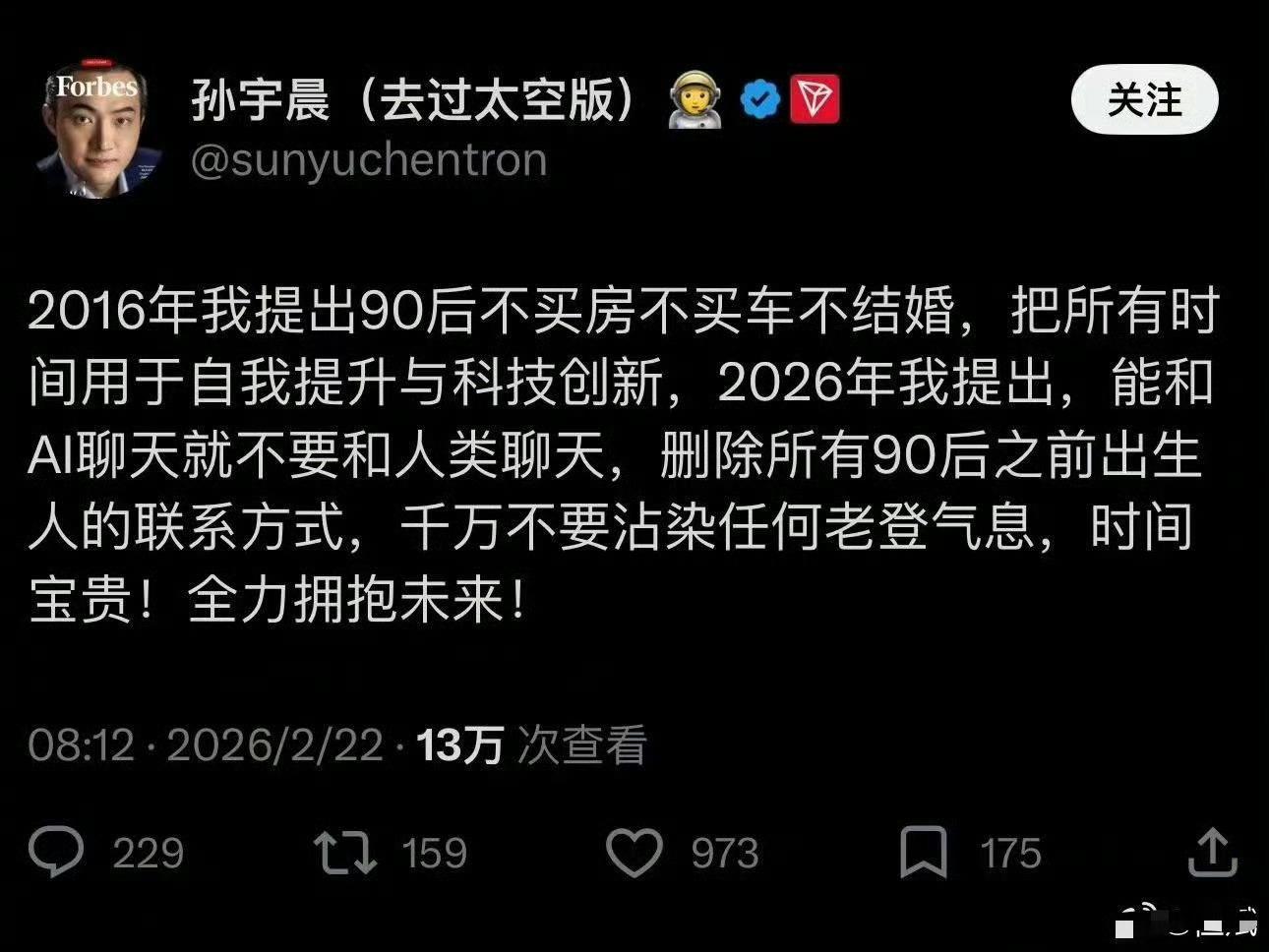 孙宇晨的最新观点:不要跟90年之前的人打交道。