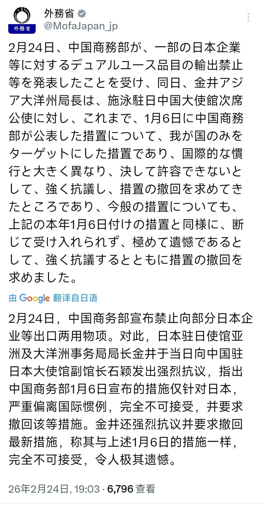 日本外务省严正抗议并敦促中方撤回管制措施。日本外务省今晚(2月24日晚)回应:“2月24日,针对中国商务部宣布对部分日本企业等实施军民两用物品出口管制的措施,日本外务省亚洲大洋洲局局长金井务召见中国驻日本大使馆公使施泳,就中方举措提出强烈抗议,并要求撤销相关管制。 可问题在于,日本外务省压根不提自身问题,反而倒打一耙,一副受害者的模样。他们刻意回避这些被管制企业的违规隐患,无视中方维护国家安全的正当权益,反而指责中方举措不合理,还敢敦促中方撤回管制,这般嚣张气焰,简直是没认清自身定位。 然而,面对日本外务省的无理抗议,中方态度十分明确,没有丝毫妥协退让。中国外交部发言人毛宁24日明确表示,此举是为维护国家安全和利益、履行防扩散等国际义务,目的是制止日本“再军事化”和拥核企图,完全正当、合理、合法。 更关键的是,被列入管控名单的企业绝非无辜之辈。其中就包括三菱造船株式会社等企业,这些企业长期参与日本军事装备相关项目,三菱重工、IHI株式会社等相关企业股价当日均出现下跌,且已纷纷表态正在核实此事、关注事态发展。 不过,最让人不齿的是,日本向来双重标准,自身频繁实施出口管制,打压其他国家企业,却容不得中方采取正当防卫措施。此前日本跟随美国,多次对中国企业实施技术封锁和出口限制,如今轮到自己被管制,就急着抗议,这般双标嘴脸,暴露无遗。 话说回来,中国实施这次管制,核心目的就是维护自身国家安全和地区和平稳定。近年来,日本不断扩充军备,提升军事实力,还频繁在地区事务中挑起事端,中方的管制举措,既是对自身安全的保护,也是对地区和平的负责,绝非针对日本整个国家和所有企业。 更何况,中方也留有余地,对于列入关注名单的日本实体,只要其履行配合核查义务,提交相关承诺,证明两用物项不会用于军事用途,就可以申请移出关注名单,这已经是中方释放的善意,可日本外务省却视而不见,一味无理抗议。 说到底,日本外务省的抗议纯属无理取闹、倒打一耙。中国实施军民两用物品出口管制合法、合理、合情,既是维护自身安全的正当举措,也是履行国际责任的体现,中方绝不会因为日本的抗议就撤回管制,若日本继续嚣张,最终只会自食恶果。 以上是小编个人看法,如果您也认同,麻烦点赞支持!有更好的见解也欢迎在评论区留言,方便大家一同探讨。