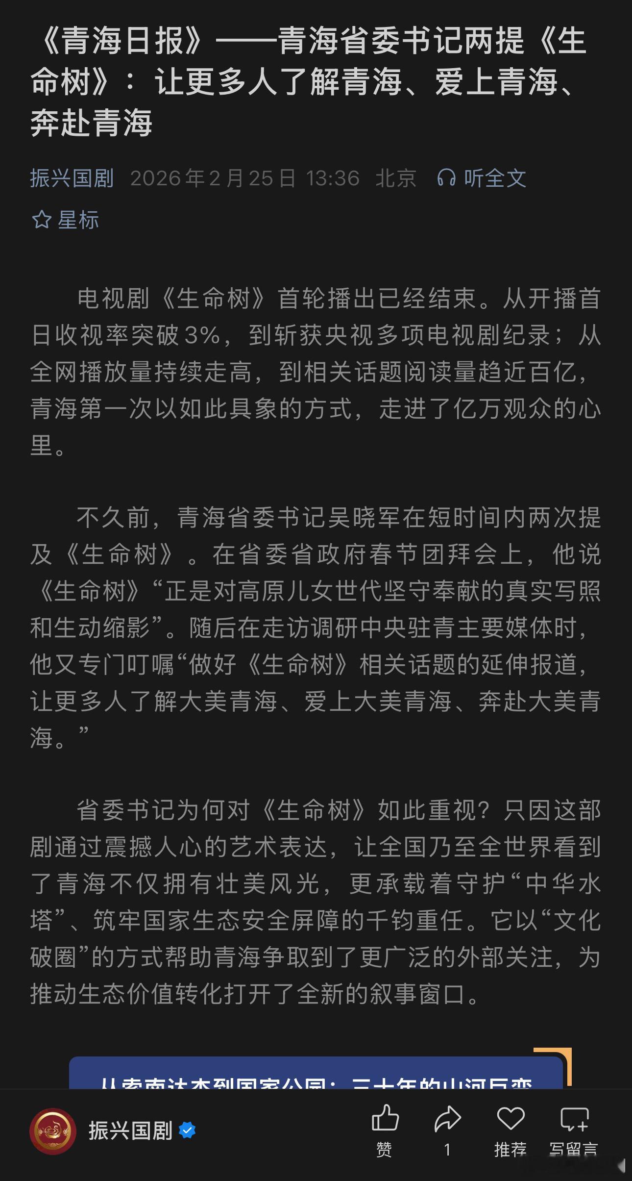 振兴国剧发布推文:《青海日报》报倒——青海省委书记两提《生命树》:让更多人了解青