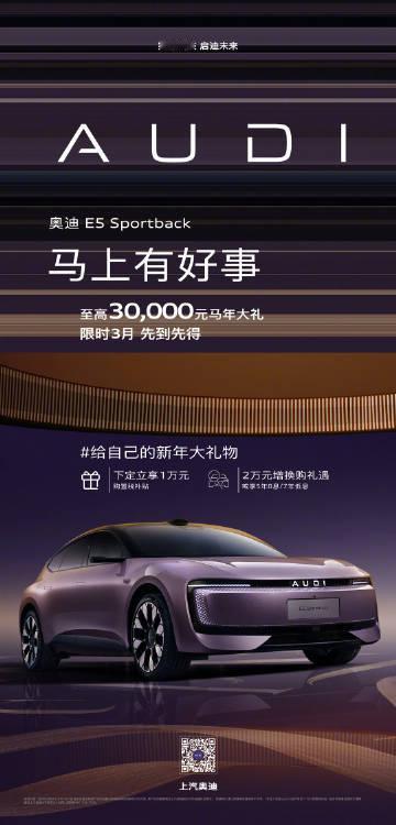 奥迪E5开年抢先优惠20.59万马年开局王炸!奥迪E5Sportback震撼