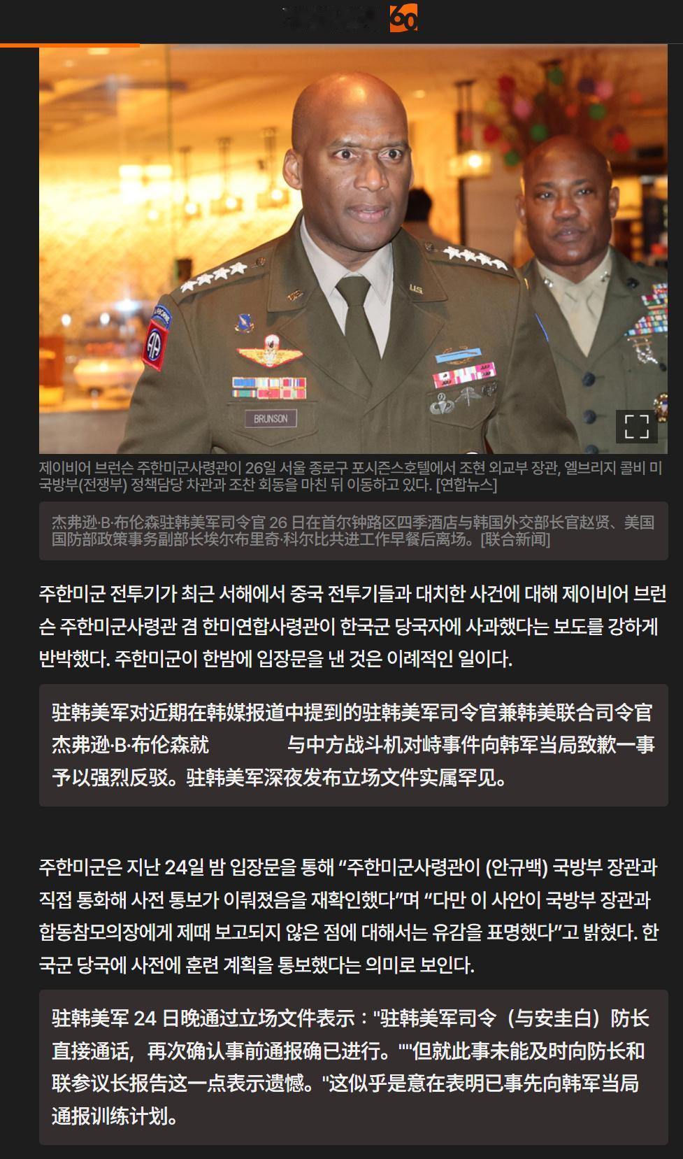 黄海空中对峙事件持续在发酵中:韩国最先报道,说自己事先不知情→美国没有否认→中国本来想低调处理,但既然韩国已经报道了,不得不报道→韩国说需要驻韩美军道歉→过了两天韩国说驻韩美军已经道歉→驻韩美军说没有道歉,且行动前已经和韩国通气…… 目前的剧本脚本正在在沿着终南剑客老师的推演在演绎,接下来的脚本应该是这样的: 韩美唱双簧,为联合国军移交给韩国做准备,为美国逐步退出驻韩美军做准备,南北韩的问题由南北韩自己来面对。军事问题,终南剑客老师不愧是教授!